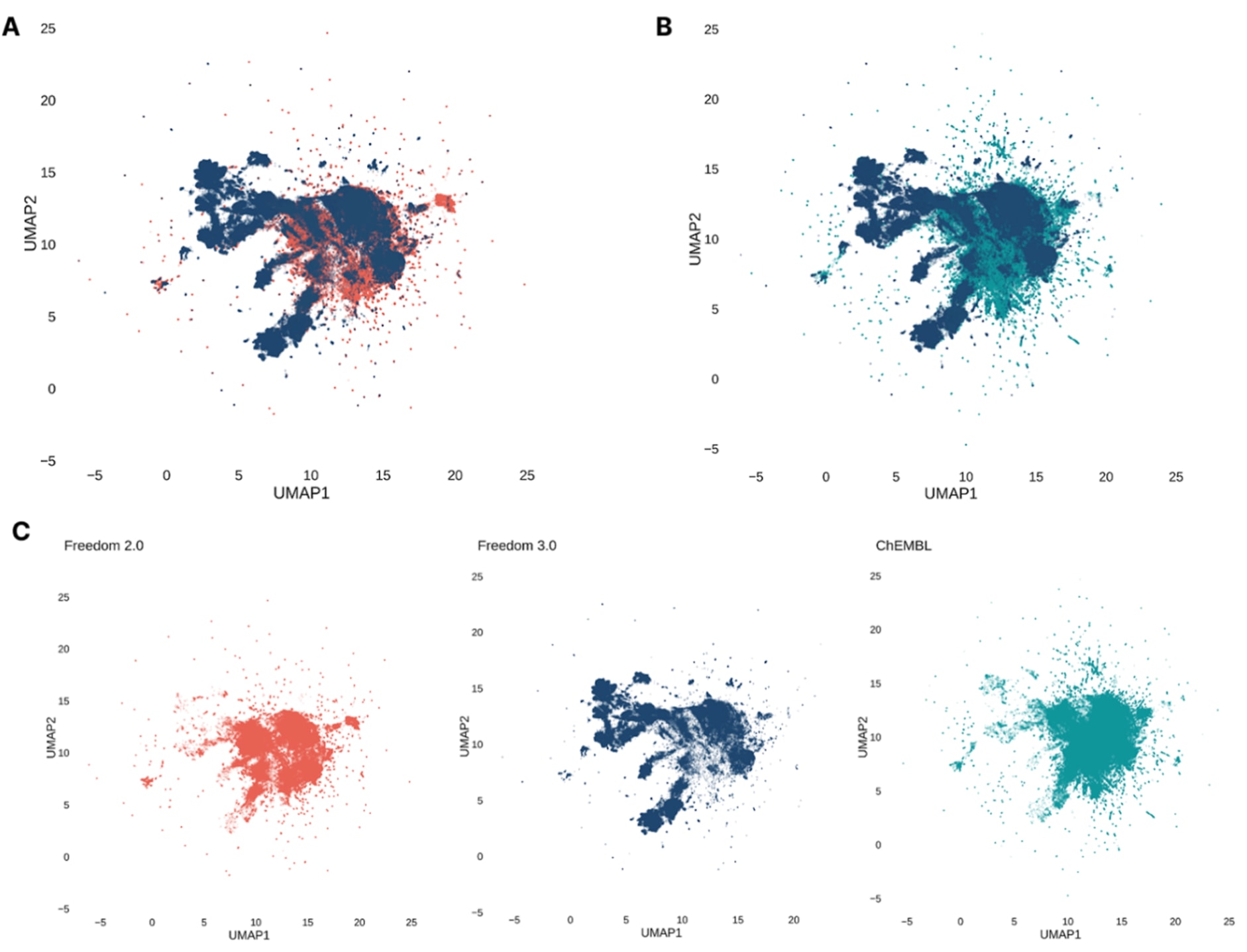图3 | Freedom Space 2.0(·)、Freedom Space 3.0(·)以及ChEMBL数据库(·)骨架的分析结果。 对于ChEMBL数据集,其骨架基于整个数据库计算。(A) Freedom Space 2.0与Freedom Space 3.0的UMAP表示重叠情况;(B) Freedom Space 3.0与ChEMBL35的UMAP表示重叠情况;(C) Freedom Space 2.0、Freedom Space 3.0与ChEMBL35数据库的UMAP嵌入可视化结果。