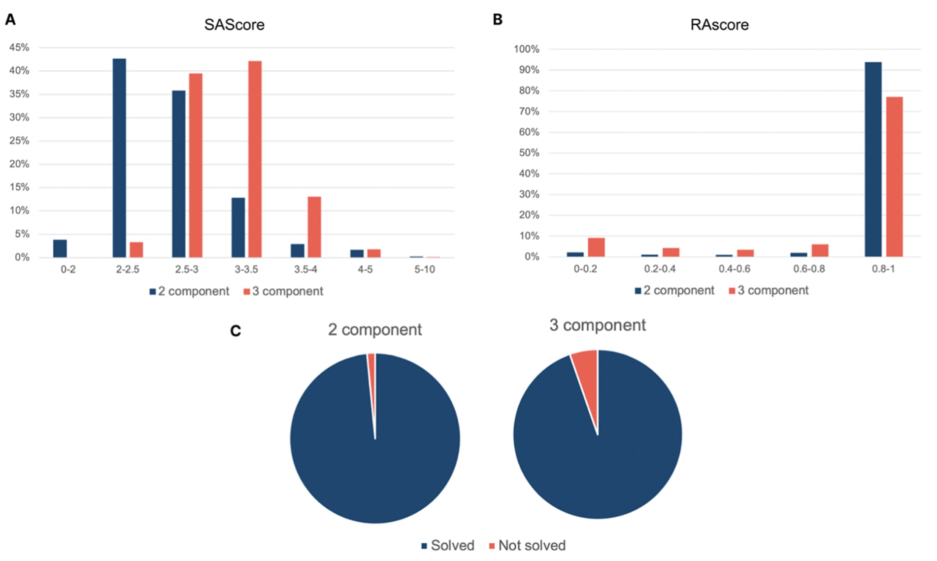 图4 | Freedom Space 3.0分子合成可及性的计算评估(分别从双组分与三组分子空间中各随机抽取5万个分子),基于SAscore(A)、RAscore(B)与AiZynthFinder(C)的结果。 “Solved”表示成功生成逆合成路径,“Not solved”表示在指定参数下生成失败。(随机抽样细节及完整的合成可及性评估设置见方法部分)