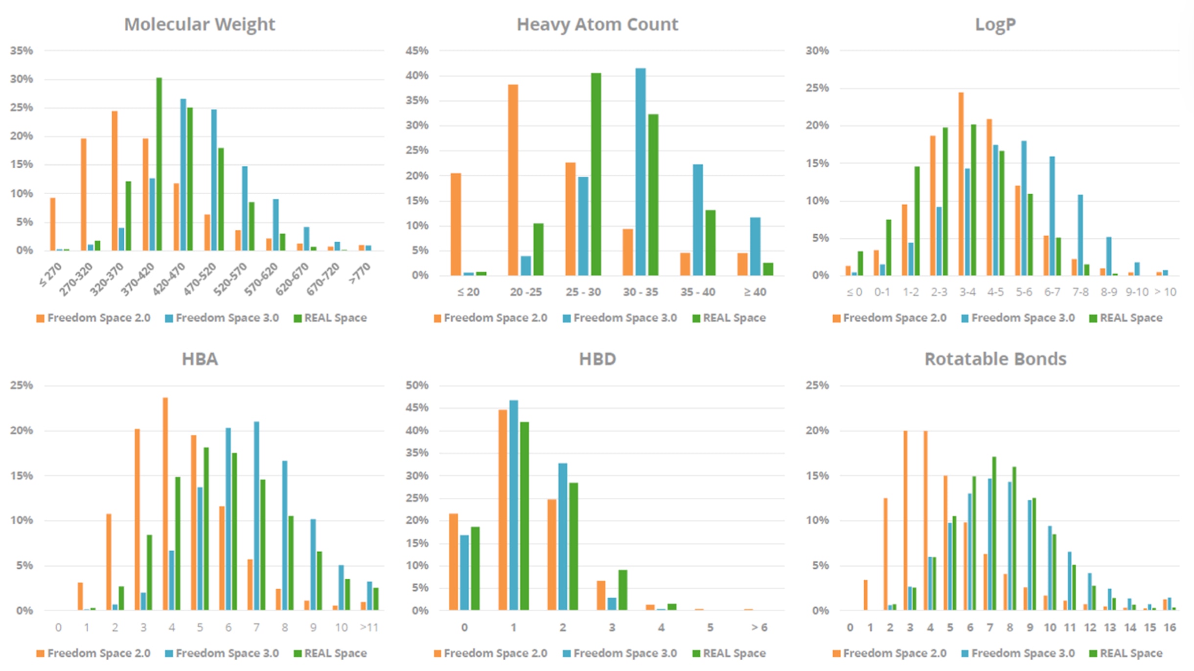 图2 | Freedom Space 3.0的理化性质概况(分子量、重原子数(非氢原子数)、LogP(溶质在正辛醇与水之间的分配系数对数)、HBA(氢键受体数)、HBD(氢键供体数)以及可旋转键数(非环状、与非末端重原子相连的单键数)),并与Freedom Space 2.0及Enamine REAL Space(版本:2025年5月)进行对比。所有性质均由RDKit计算获得。