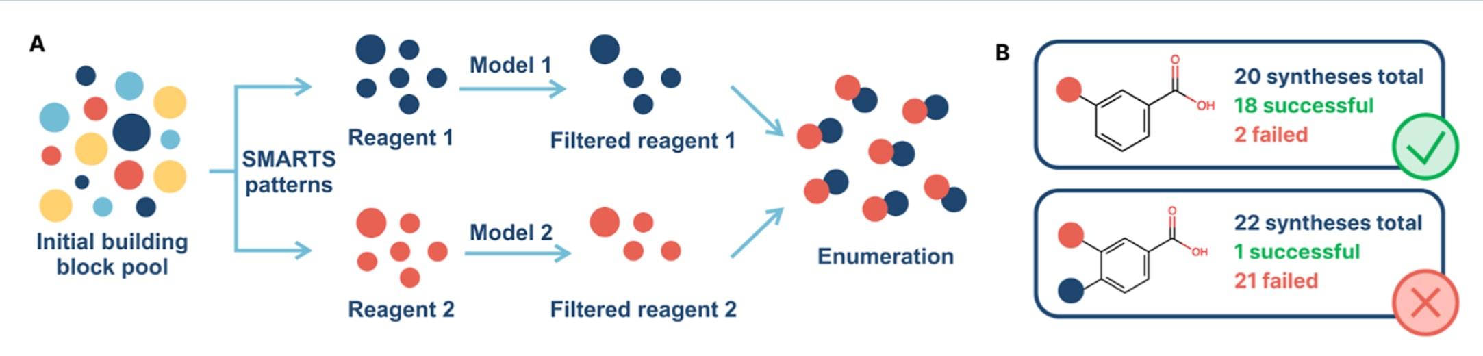 具体步骤包括:首先建立一个经过整理的构建模块/试剂集合,来源于可信供应商提供的商业化合物。随后,通过基于SMARTS的模式匹配方法,为每种目标反应选择相应的试剂子集,以确保其化学合理性。接着,这些初始试剂池会进一步由机器学习二分类模型筛选,模型预测每个试剂在对应反应体系中成功参与的概率,仅保留被判定为合适的试剂。最后,基于这些筛选后的试剂进行组合枚举,生成具有高合成可行性的组合化学数据集。
