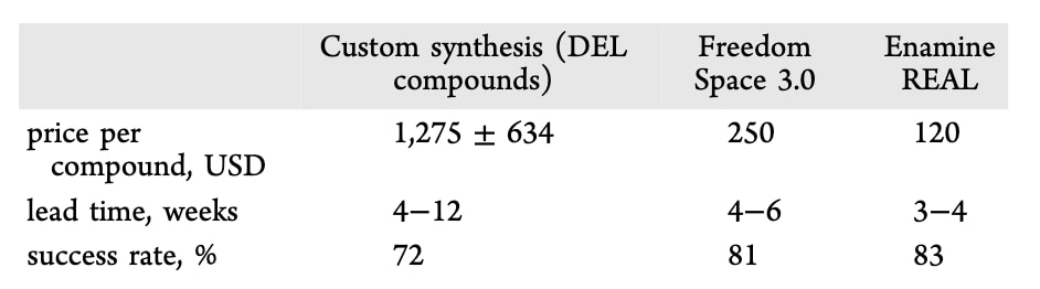 表2 | 三个关键参数(价格、交付周期与成功率)在三类来源化合物间的对比:定制的Off-DNA合成、Chemspace Freedom Space与Enamine REAL Space。