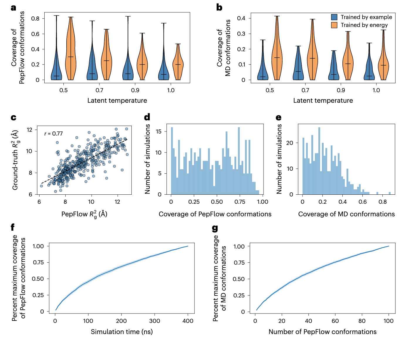 图3 | PepFlow生成的构象集合与分子动力学模拟的比较 a,能量驱动训练前后,在不同潜在温度下,PepFlow采样构象被验证用分子动力学(MD)构象覆盖的情况。b,能量驱动训练前后,在不同潜在温度下,验证用分子动力学构象被PepFlow采样构象覆盖的情况。c,PepFlow与测试用分子动力学构象的回转半径(