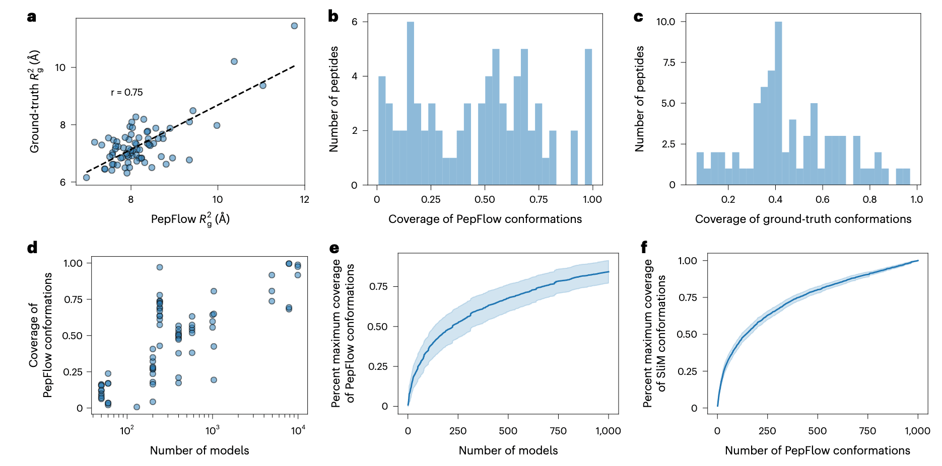 图4 | PepFlow在SLiM集合生成中的性能。 a,PepFlow与真实构象的