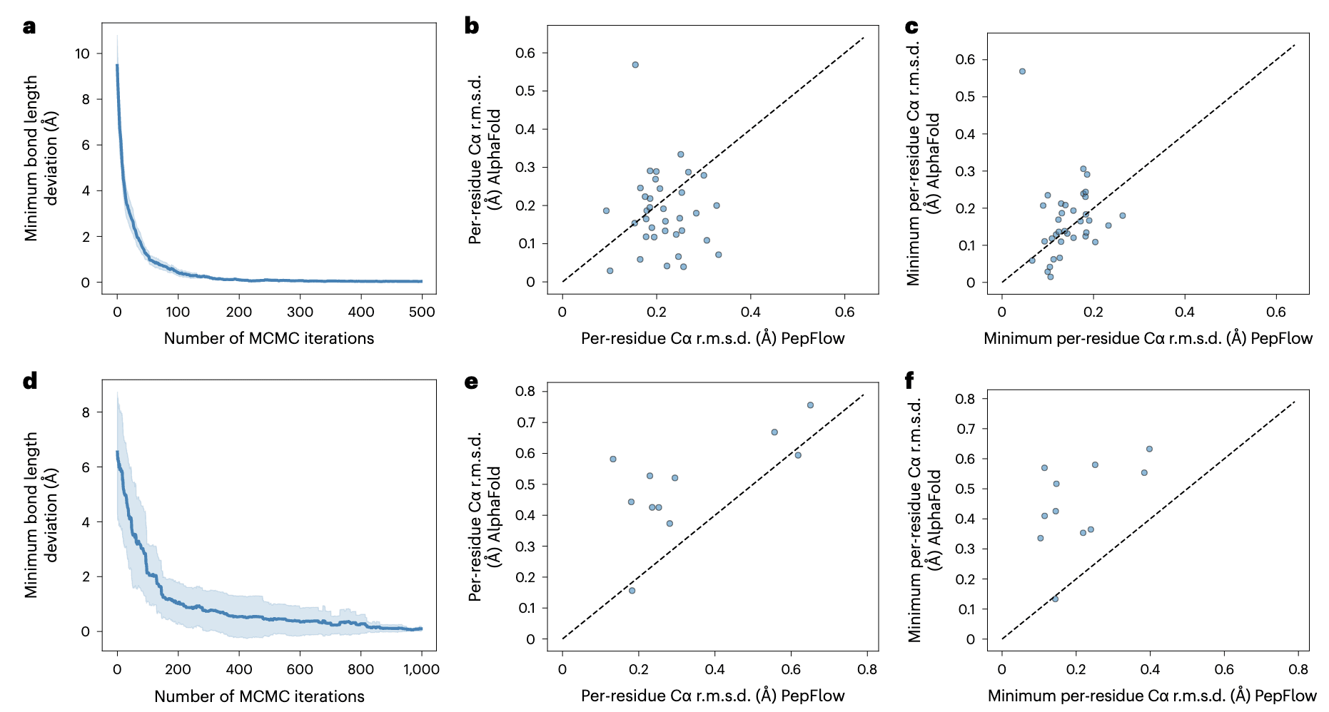 图5 | PepFlow在大环肽结构预测中的性能。 a,头尾环化肽在MCMC迭代过程中的平均键长偏差,阴影表示90%置信区间;b,头尾环化肽中AF2与PepFlow的最佳预测结果r.m.s.d.比较;c,头尾环化肽中AF2与PepFlow预测的最小r.m.s.d.比较;d,侧链环化肽在MCMC迭代过程中的平均键长偏差,阴影表示90%置信区间;e,侧链环化肽中AF2与PepFlow的最佳预测结果r.m.s.d.比较。