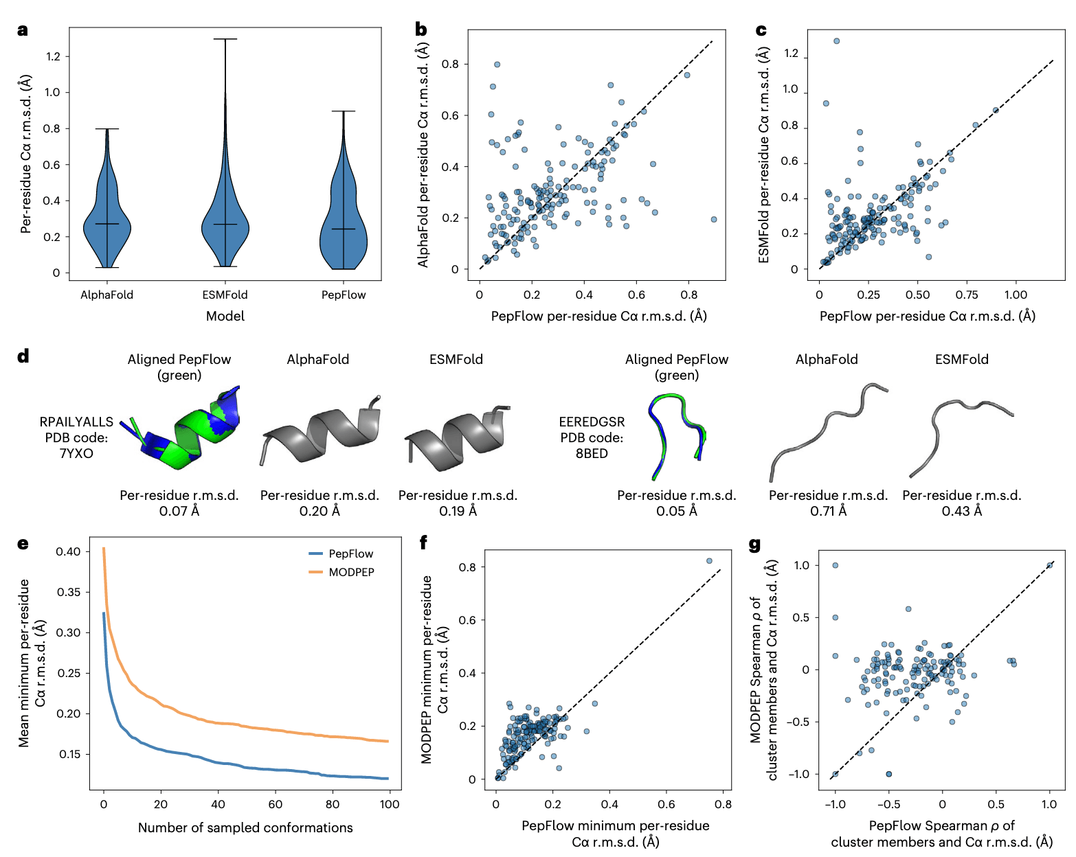 值得注意的是,PDB中的多数肽结构是以复合物形式解析的,肽在结合过程中常会发生构象变化。因此,单独预测在缺乏结合环境时必然存在不足。为此,进一步评估了PepFlow在高采样条件下预测结合态肽构象的能力,并与MODPEP方法进行对比。后者通过二级结构预测与片段组装生成结合态肽结构。结果表明,PepFlow在大多数情况下优于MODPEP,能够准确捕捉已解析的肽构象(图2e,f)。通过对生成的构象进行排名比较,PepFlow结果与真实结构表现出更强的相关性(图2g),说明其更频繁地产生准确的肽结构。
