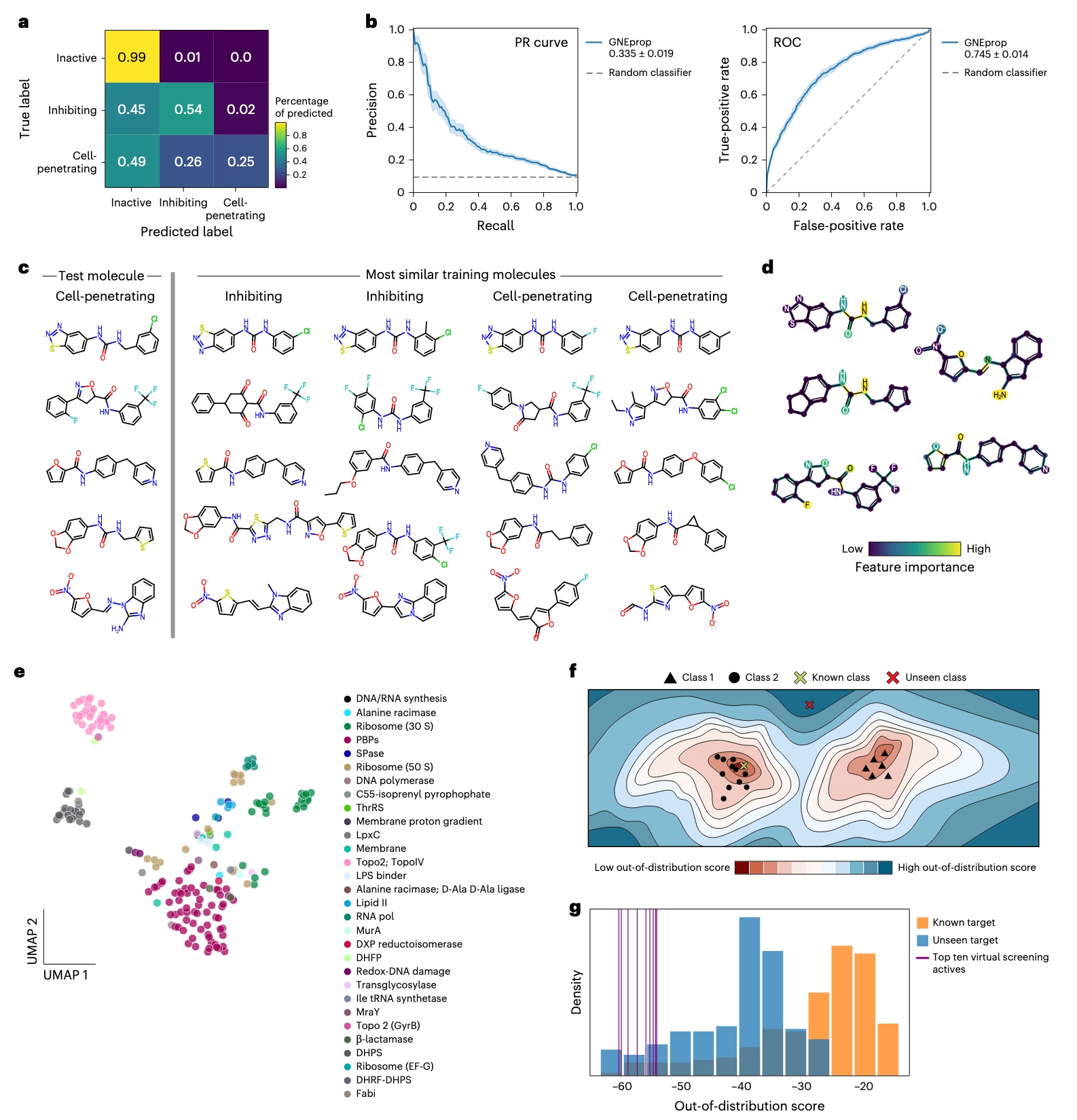 图6|利用 GNEprop 探索革兰氏阴性菌的细胞包膜通透性与作用机制(MoA)特征。 (a–d) 基于双重筛选(double-assayed HTS)的 GNEprop 模型揭示细胞包膜屏障特征。 (a) 混淆矩阵。 模型区分三类化合物:非活性(inactive)、抑制型(inhibiting,仅对 E. coli ΔtolC 有活性)及可穿透型(cell-penetrating,同时对 E. coli ΔtolC 与野生型 E. coli 活性)。 (b) 模型分类性能。 展示 GNEprop 区分“可穿透型”与“抑制型”化合物的 ROC 曲线,图例中的数值表示曲线下面积(AUC),阴影区域为基于20次骨架划分的标准误。 (c) 通透性活性悬崖(activity cliffs in permeability)。 对五种代表性可穿透化合物(左列),展示其最相似的两种“抑制型”和“可穿透型”结构对比,揭示细微结构差异如何影响通透性。 (d) 化学特征重要性可视化。 将模型预测的关键化学特征(原子与键的重要性)叠加于(c)中选定的可穿透化合物结构上。模型识别出的高重要性区域(颜色高亮)与已知促进通透的结构基团(如伯胺)一致。(e–g) 探索性分析:早期识别潜在新型作用机制(MoA)。 (e) 低维表示空间中的抗生素聚类。 基于 GNEprop 自监督表示的二维嵌入,已知抗生素按靶点着色,显示不同靶标在嵌入空间中形成独立簇。 (f) 原理示意图。 在模型嵌入空间中,具新型(未见过)作用机制的分子(红色 X)远离已知靶标簇,而已有作用机制的分子(绿色 X)靠近相应簇。 (g) 分布分析与 OOD(分布外)得分。 展示通过 Mahalanobis 距离计算的 OOD 得分分布。较低得分代表结构与已知靶标差异更大。灰色与蓝色曲线分别代表已知靶标与未见靶标的参考分布,紫色标记显示虚拟筛选中得分最低的前10个候选分子,这些分子最可能具有全新作用机制。