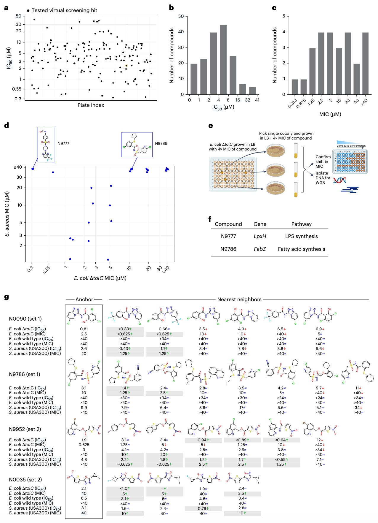 图5|虚拟筛选命中化合物的生物学表征验证其抗菌活性。 (a) 剂量–反应实验(dose–response)IC₅₀ 测定。 展示了针对 E. coli ΔtolC 的化合物在剂量–反应实验中的 IC₅₀ 分布(横轴为化合物编号),显示筛选流程的早期阶段。 (b) IC₅₀ 分布。 所有测试化合物在 E. coli ΔtolC 中的 IC₅₀ 值分布。大部分活性化合物的 IC₅₀ 低于 20 μM。 (c) 最低抑菌浓度(MIC)分布。 展示了对 E. coli ΔtolC 测得的 MIC 值分布范围(0.3–40 μM)。 (d) 不同菌株的活性谱。 将选定化合物在 E. coli ΔtolC(x 轴)与 S. aureus(y 轴)中的 MIC 值进行对比。用于靶标鉴定的代表性化合物以蓝色矩形标出。 (e) 抗性突变株筛选示意图。 展示了通过药物暴露筛选出自发获得抗性的菌株流程示意。 (f) 抗性株全基因组测序结果汇总。 图中总结了对抗性克隆测序后鉴定出的关键突变基因。结果显示:化合物 N9777 的抗性克隆中出现 lpxH 基因突变(脂多糖合成关键酶);化合物 N9786 的抗性克隆中出现 fabZ 与 acpP 突变(脂肪酸合成通路相关酶)。 这些结果揭示了化合物作用于革兰氏阴性菌的特异代谢靶点。 (g) 基于邻近结构的虚拟筛选扩展。 以 GNEprop 预测得分高的“锚点化合物”为中心(首列示例),在模型优先区域内进行局部邻域探索,从而选择额外候选分子(其余列)。每个化合物下方标注了在 E. coli ΔtolC、野生型 E. coli 与 S. aureus 中的 IC₅₀ 与 MIC 值。符号表示与锚点化合物相比的变化:↑ 表示提升超过两倍,↓ 表示降低超过两倍,≈ 表示差异在两倍以内。前两个示例展示了集合1(Set 1)中对 E. coli ΔtolC 活性(IC₅₀ 与 MIC)显著改善的化合物(如 N0090、N9786);第三个示例展示了集合2(Set 2)中两种化合物在野生型 E. coli 上 MIC 改善;第四个示例展示了集合2中在 E. coli ΔtolC 上活性显著增强的化合物。