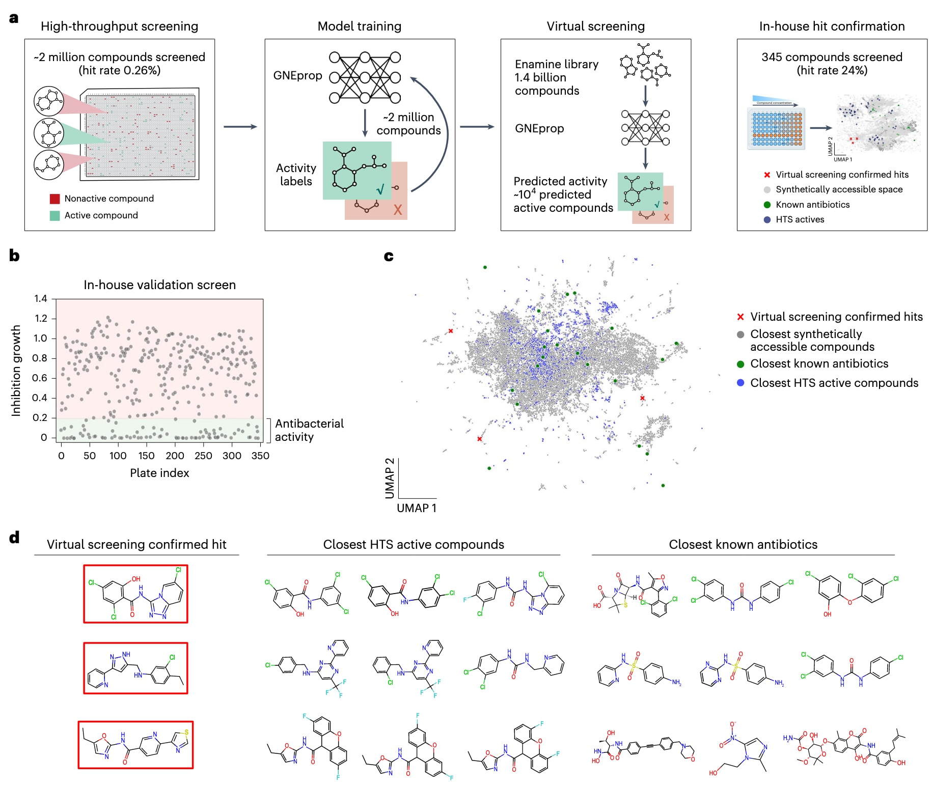 图1|高通量表型筛选结合深度学习虚拟筛选策略以发现多样化的抗菌骨架。 (a) 示意图。该研究通过两步策略将抗菌化合物的搜索空间扩展至已知抗生素之外:首先进行新的表型高通量筛选(HTS),随后采用基于深度学习的超大规模虚拟筛选以探索可合成化学空间。HTS用于鉴定与已知抗生素相似度低、但活性显著的化合物,同时覆盖广阔且多样的化学空间。基于HTS数据训练的深度学习模型 GNEprop 可在虚拟筛选中对庞大的可合成分子空间进行高效预测。虚拟筛选能够在极大化学空间中发现结构新颖、命中率高且与已知抗生素相似度低的候选分子。 (b) 使用GNEprop对超过10亿个可合成小分子进行虚拟筛选,相比HTS数据集显著富集了抗菌活性分子,命中率从 0.26% 提升至 23.8%。 (c, d) 虚拟筛选所得活性分子与HTS活性分子及已知抗生素的结构相似度均较低。 (c) 通过UMAP降维可视化结果显示,虚拟筛选命中分子(红色叉)位于与HTS活性分子(蓝点)及已知抗生素(绿色点)不同的化学空间中。 (d) 展示了虚拟筛选所得代表性分子(对应c中的红叉)与其在训练集和抗生素数据库中最相似的前三个分子的结构对比,可见这些新命中分子均具有显著的结构新颖性。