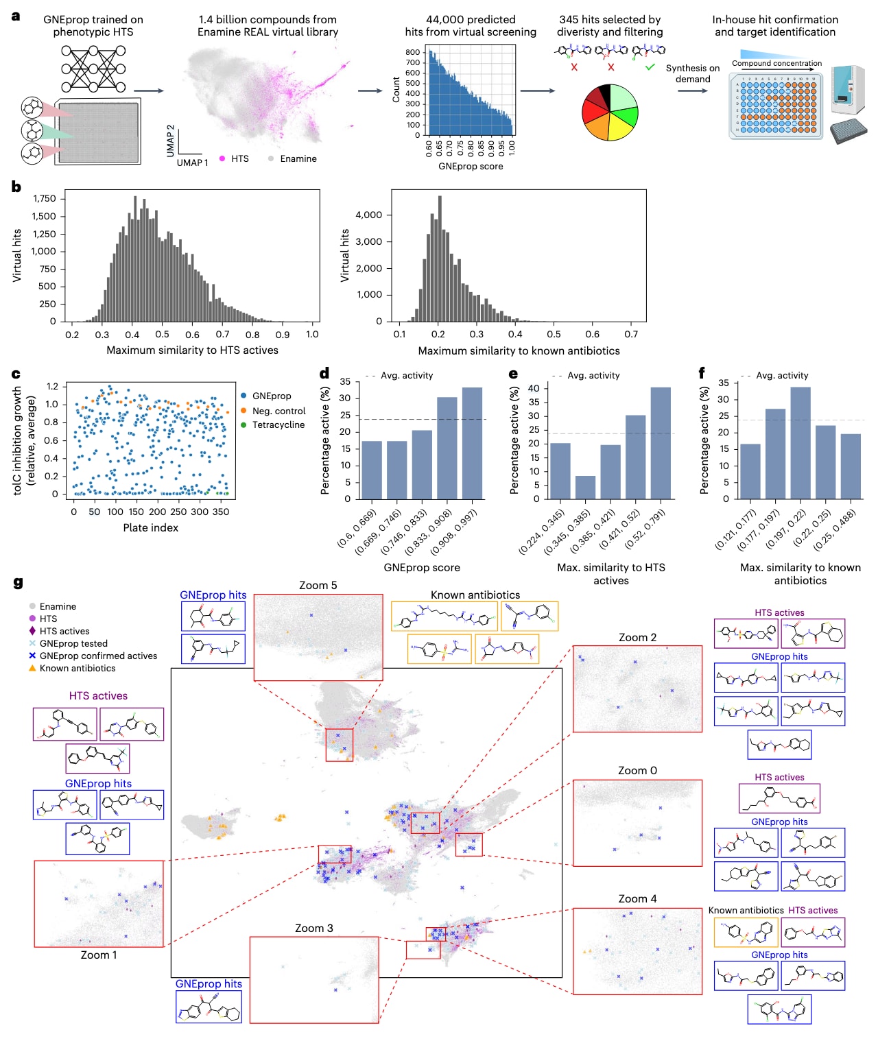 与已知抗生素相比,大多数新发现的化合物在结构上具有明显差异——其中 98.8% 的最大相似度≤0.4,且 39% 的相似度≤0.2。值得注意的是,命中率与与已知抗生素的相似度之间并无显著相关(图4f),这可能得益于HTS数据集本身已覆盖了更广的化学空间。
