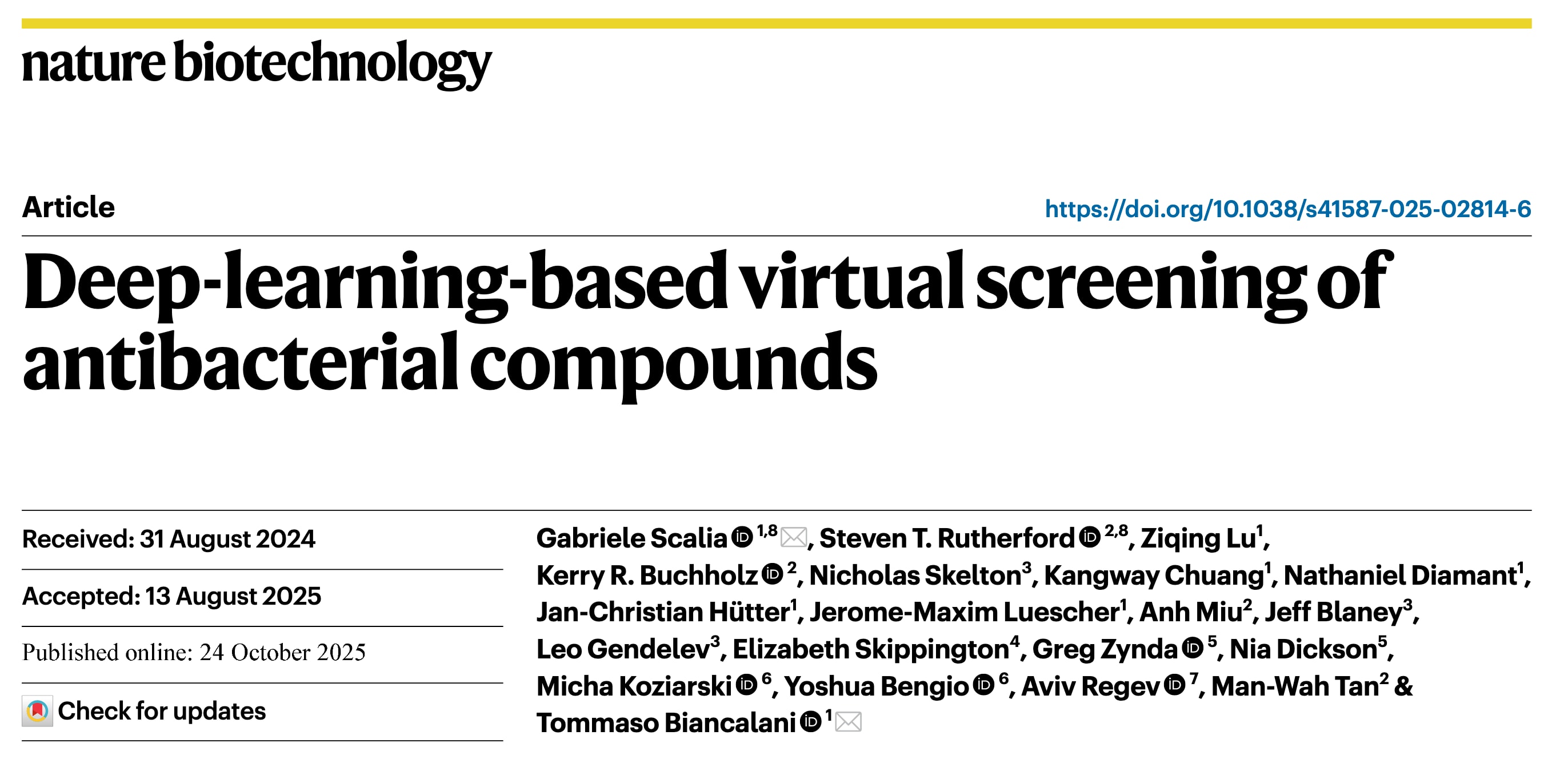 今天介绍的研究来自 Genentech 团队,发表于 Nature Biotechnology 。该工作提出了一个结合高通量实验与深度学习的抗菌化合物发现框架——GNEprop。研究者首先针对约 200 万种小分子 进行表型高通量筛选,从中获得 5,000 余个对 E. coli ΔtolC 有活性的分子,并据此训练图神经网络模型 GNEprop,用于预测全细胞水平的抗菌活性。随后,模型被用于对 14 亿个可合成分子 进行虚拟筛选,实验验证显示命中率高达 23.8%,比原始 HTS 提高约 90 倍。更重要的是,这些命中化合物在结构上与已知抗生素高度不同,展现出全新的化学骨架和潜在作用机制。进一步的生物学验证确定了部分分子作用于脂多糖和脂肪酸合成通路中的关键酶。该研究展示了深度学习与实验筛选协同加速抗菌药物发现的巨大潜力,为探索新型抗生素开辟了可扩展的计算–实验一体化范式。