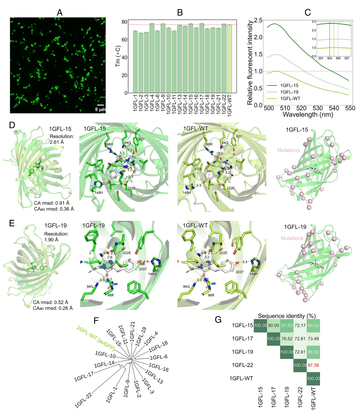 绝对量子产率测定表明,1GFL-15与野生型相当,而1GFL-19约为其1/3。两者与野生型序列同一性分别为86.52%与87.83%。晶体结构解析显示,1GFL-15分辨率为2.61 Å,1GFL-19为1.90 Å(图4D、E),其总体结构与野生型高度一致,Cα RMSD分别为0.91 Å与0.52 Å。