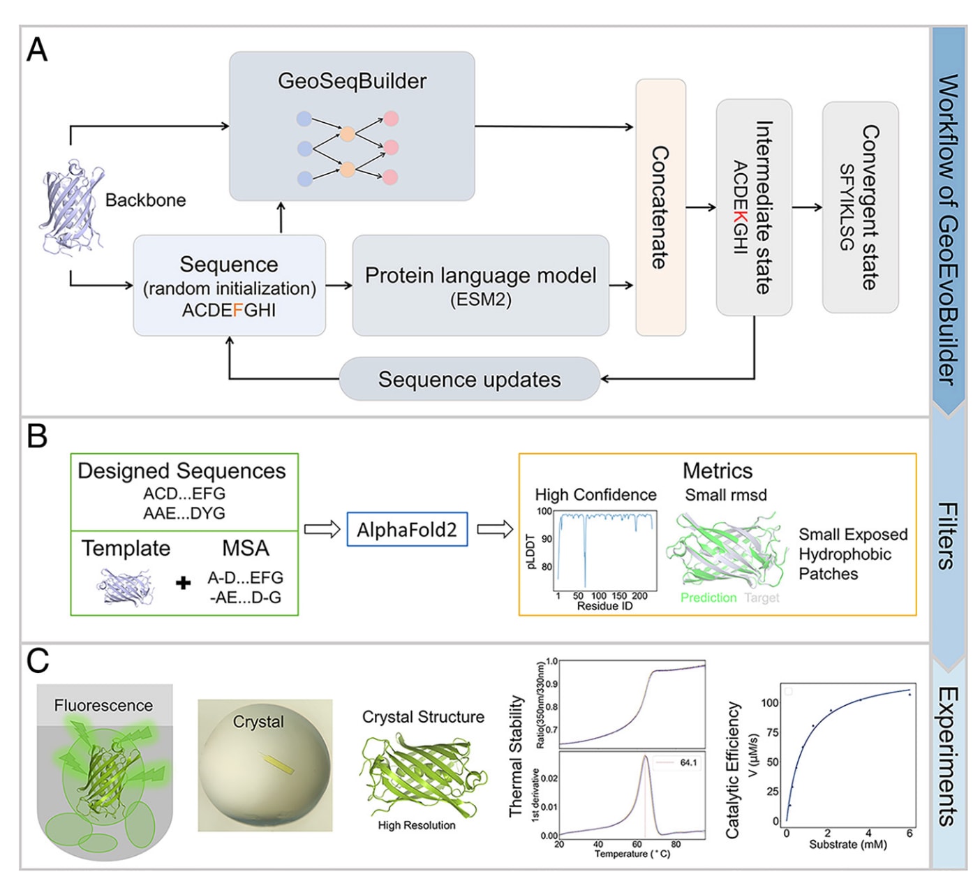 图1|GeoEvoBuilder功能性蛋白序列生成模型概览 (A) GeoEvoBuilder的核心机制:模型通过整合GeoSeqBuilder与ESM2的信息,实现序列的迭代式生成。GeoSeqBuilder用于提取给定蛋白主链的结构特征信息,以增强生成序列的折叠能力;ESM2则提供进化信息,以维持蛋白的功能特性。(B) 结构预测与筛选:利用AlphaFold2 (AF2)对生成序列进行结构预测与质量评估,并据此选择高置信度序列。(C) 功能验证与表征:对筛选得到的设计序列进行多种功能性质实验验证与活性表征,以评估模型生成蛋白的实际性能。
