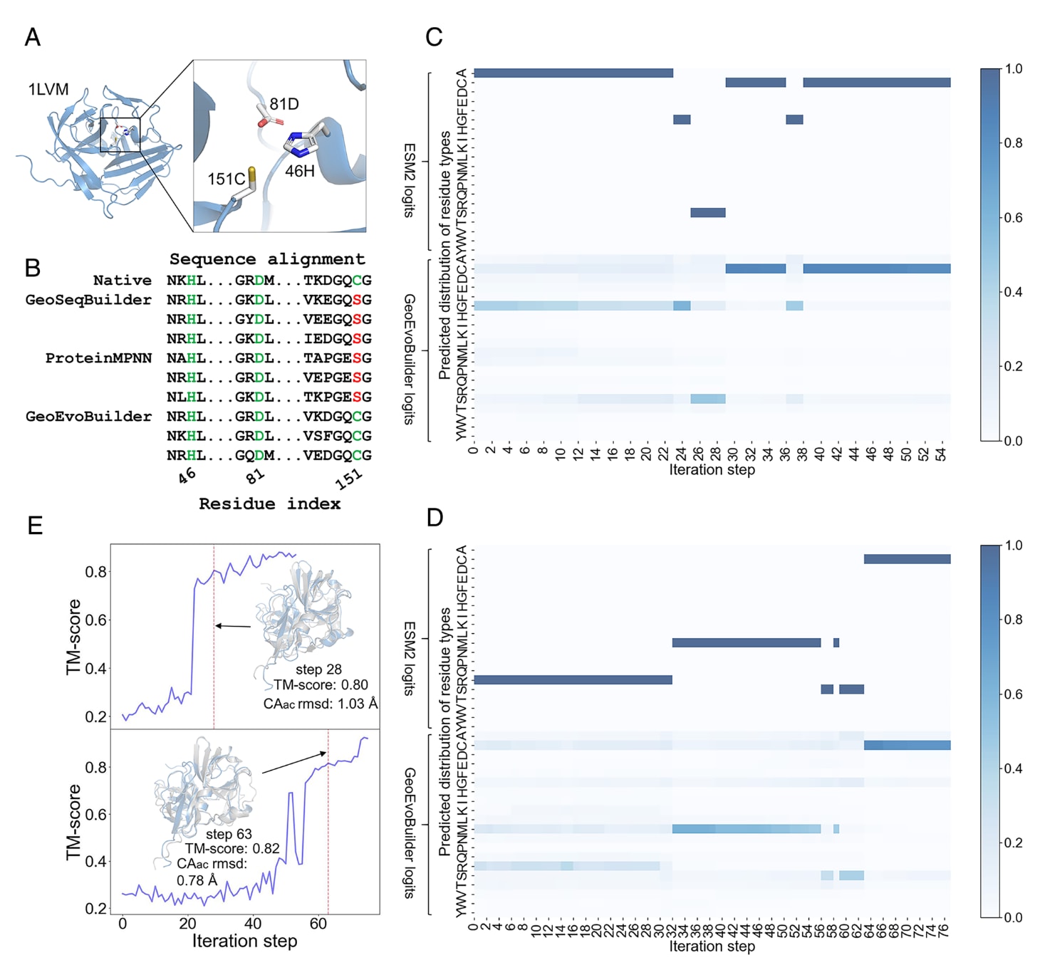 图3|GeoEvoBuilder学习恢复功能位点的过程 (A) TEV蛋白酶的催化活性位点示意图。(B) GeoEvoBuilder在最终设计阶段成功恢复催化残基151C,而基于结构的GeoSeqBuilder与ProteinMPNN均未能回忆该关键位点。(C) 与(D) 展示了GeoEvoBuilder在两种不同初始条件下恢复催化残基151C的动态过程:分别从随机掩盖50%天然序列与完全随机初始化开始。前20行表示来自GeoEvoBuilder中嵌入ESM2的logits残基类型分布,后20行为GeoEvoBuilder模型预测的残基类型分布。(E) 上、下两部分分别对应(C)与(D)中的中间序列,其预测结构的TM-score变化反映了折叠收敛过程。可见,在第28步(上方)与第63步(下方)时,预测结构已与野生型高度相似,尽管此时功能位点151C尚未恢复。这进一步说明,结构模块GeoSeqBuilder在保持蛋白骨架结构中发挥关键作用。其中“Cα rmsd”表示活性位点区域的Cα原子均方根偏差。