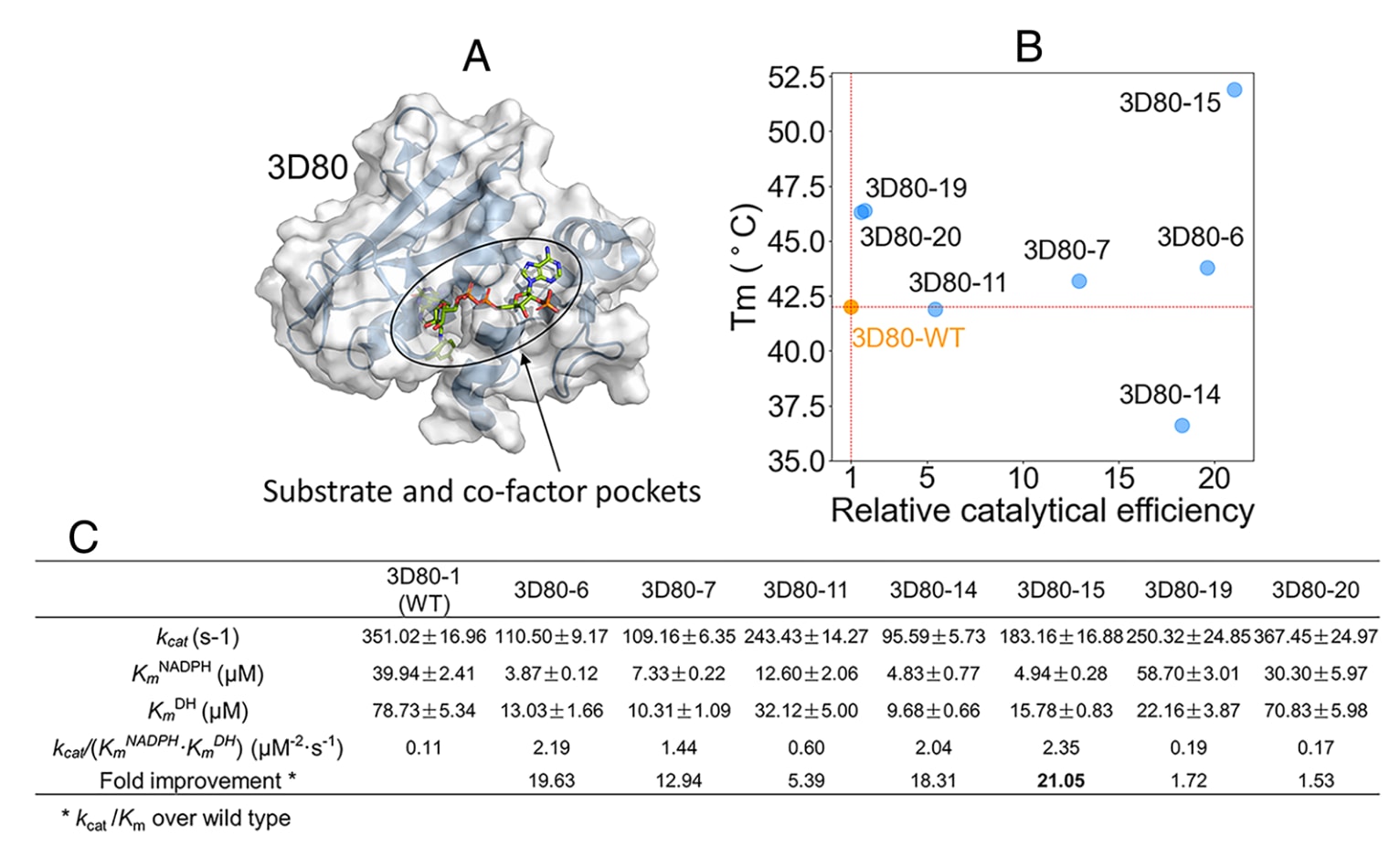 动力学结果显示,设计蛋白的催化效率提升1.53–21.05倍,其中3D80-15的催化效率提升超过20倍,同时热稳定性提高10 °C(图6C)。