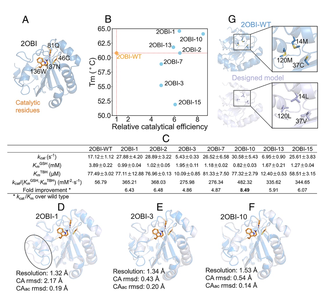 高分辨率晶体结构显示,2OBI-3与2OBI-10相对野生型的Cα RMSD分别仅为0.43 Å与0.54 Å,而2OBI-1在排除柔性loop区后RMSD仅0.70 Å(图5D–F)。核心残基中,野生型14M、37C、120M被替换为14L、37V与120L(图5G),可能增强稳定性。