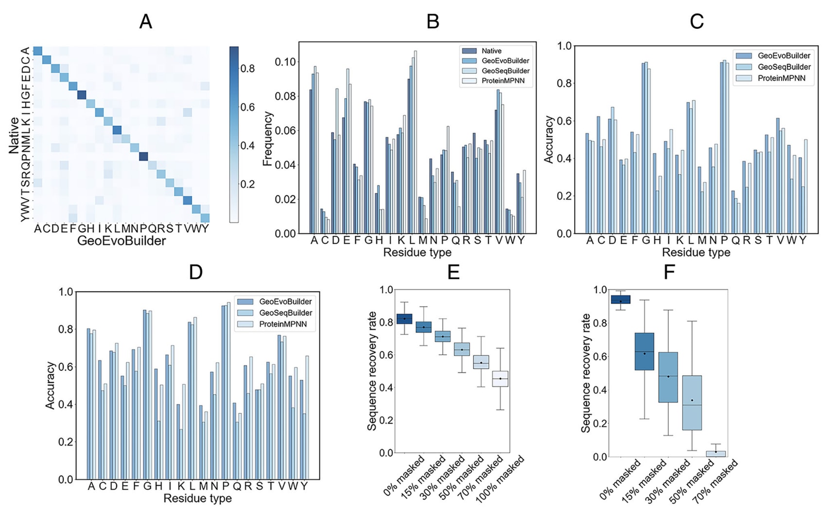 图2|GeoEvoBuilder在TS1000与CAMEO41数据集上的性能表现 (A) 各类型氨基酸残基的整体恢复率概览。(B) 预测残基与天然残基分布的对比分析。(C) loop区域中残基的预测准确率。(D) **埋藏残基(buried residues)**的预测准确率。(E) GeoEvoBuilder在不同初始序列设置下于CAMEO41数据集中的序列恢复率。(F) ESM2在相同条件下的序列恢复率对比。