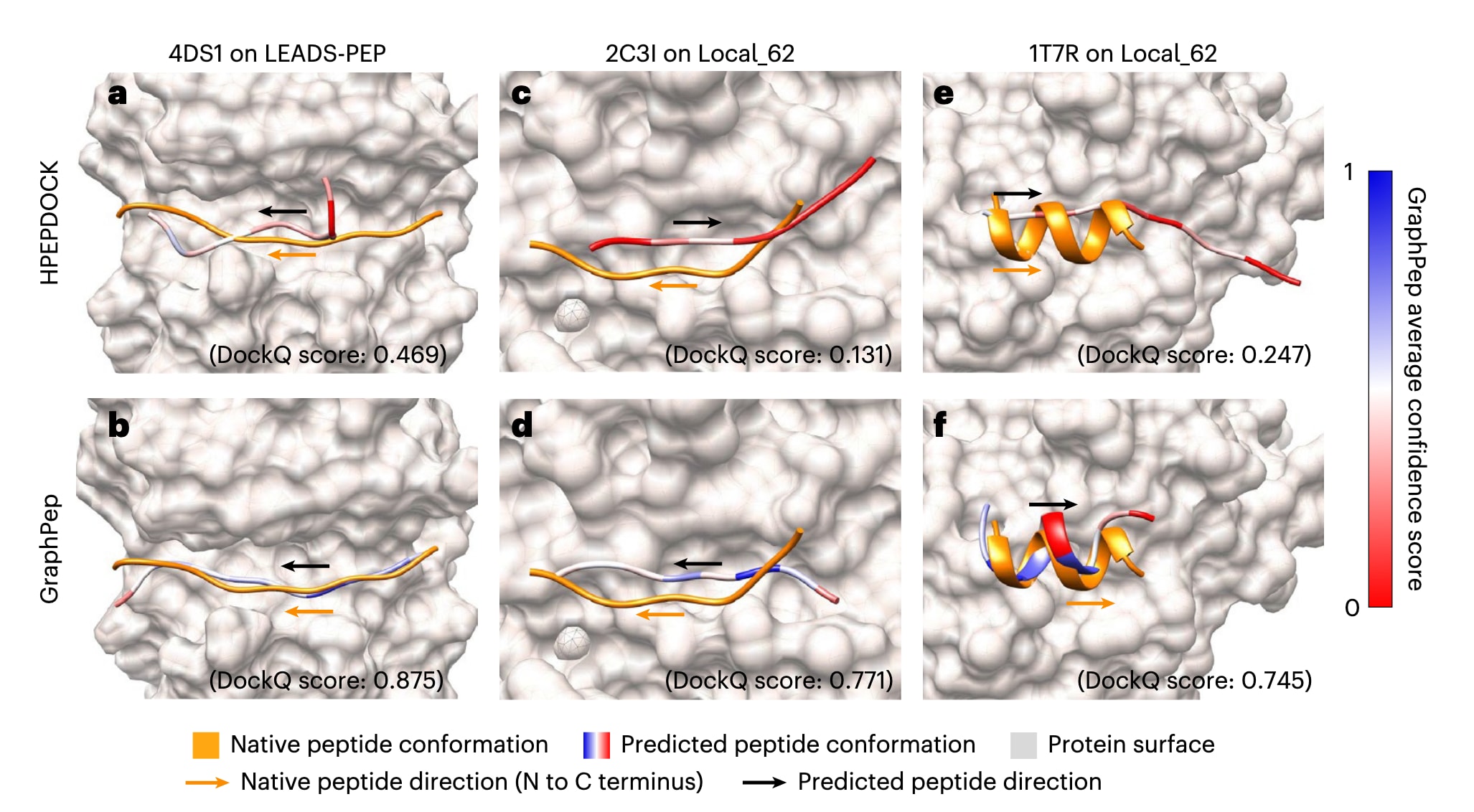 图6 | HPEPDOCK与GraphPep预测的Top结合模式示例。 a–f,第一行分别展示了HPEPDOCK对4DS1(a)、2C3I(c)与1T7R(e)的Top结合模式预测结果;第二行则展示了GraphPep对4DS1(b)、2C3I(d)与1T7R(f)的对应预测结果。
