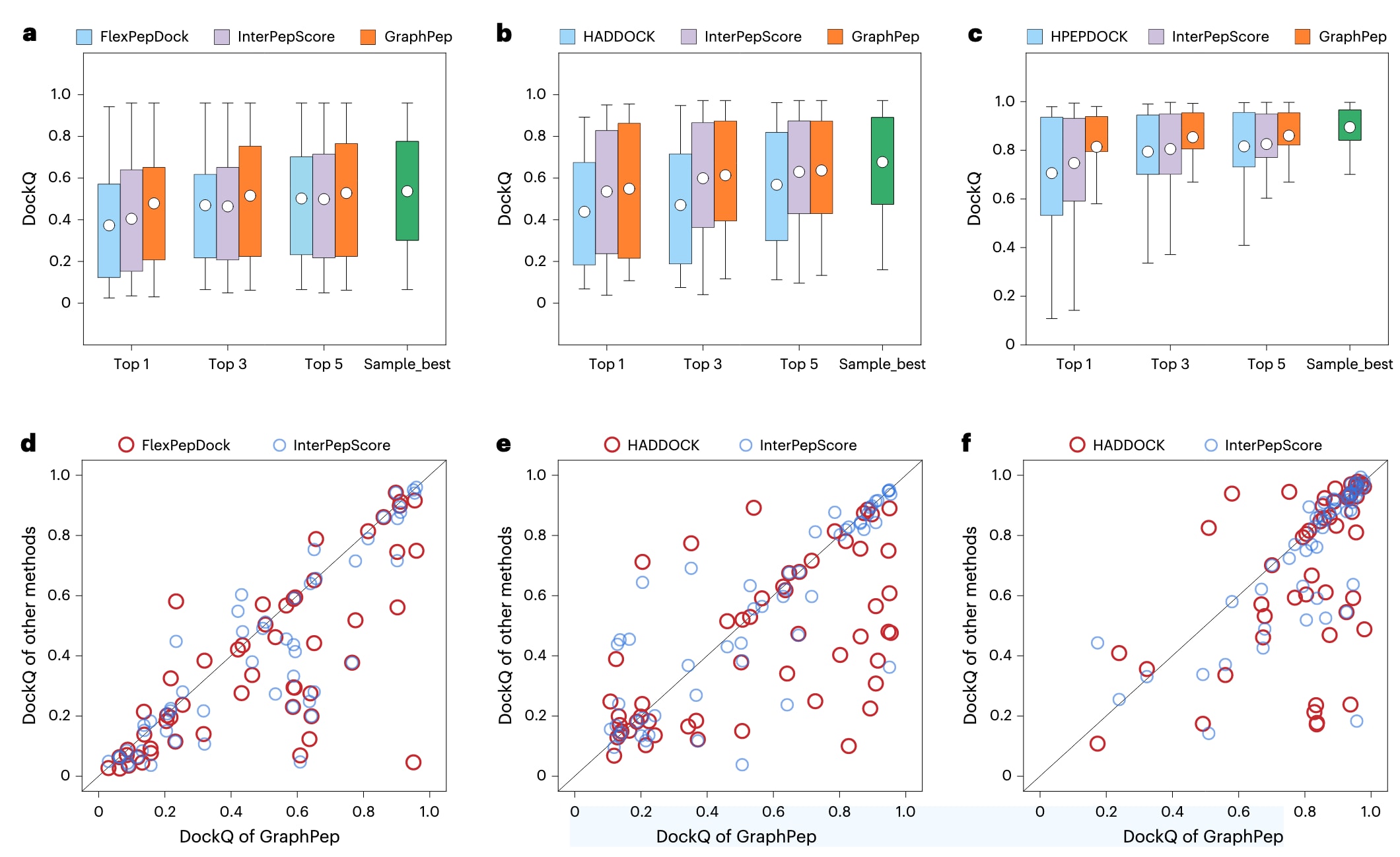 图2 | GraphPep与其他方法在LEADS-PEP结合态测试集上的比较。 a–c,不同方法在由FlexPepDock(a)、HADDOCK(b)与HPEPDOCK(c)生成的诱饵数据集上的Top 1、Top 3与Top 5预测结果(n = 53)的DockQ箱线图。图中圆点表示平均值,箱体边缘表示四分位区间,须线表示1.5倍四分位距。作为参考,同时展示了采样效果最佳诱饵的结果。d–f,GraphPep与其他方法在由FlexPepDock(d)、HADDOCK(e)和HPEPDOCK(f)生成的诱饵数据集上的Top 1 DockQ分数散点图,用以直观比较不同模型的预测精度。