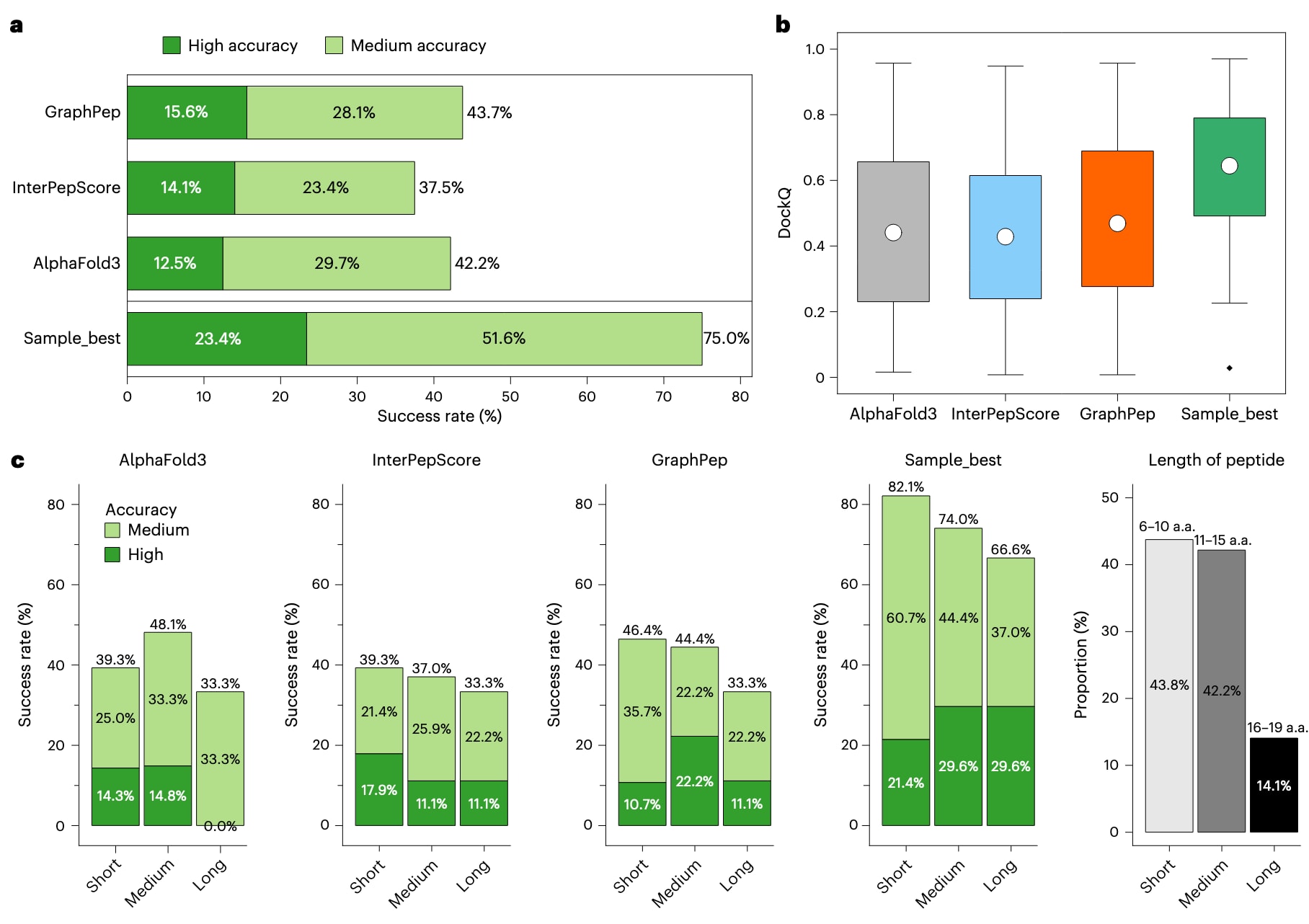 图5 | GraphPep与其他方法在nr_epitope_minus测试集上的比较。 该测试集的诱饵由AlphaFold3通过增强采样生成。a,不同方法的总体成功率比较。b,Top 1预测的DockQ分数箱线图(n = 64),圆点表示平均值,箱体边缘表示四分位区间,须线表示1.5倍四分位距。c,不同肽长度范围内的成功率比较。右侧展示了短肽(6–10个氨基酸)、中等长度肽(11–15个氨基酸)与长肽(16–19个氨基酸)的比例。成功率计算仅考虑每个复合物的Top 1预测结果。作为参考,同时展示了AlphaFold3生成的最佳采样诱饵结果。