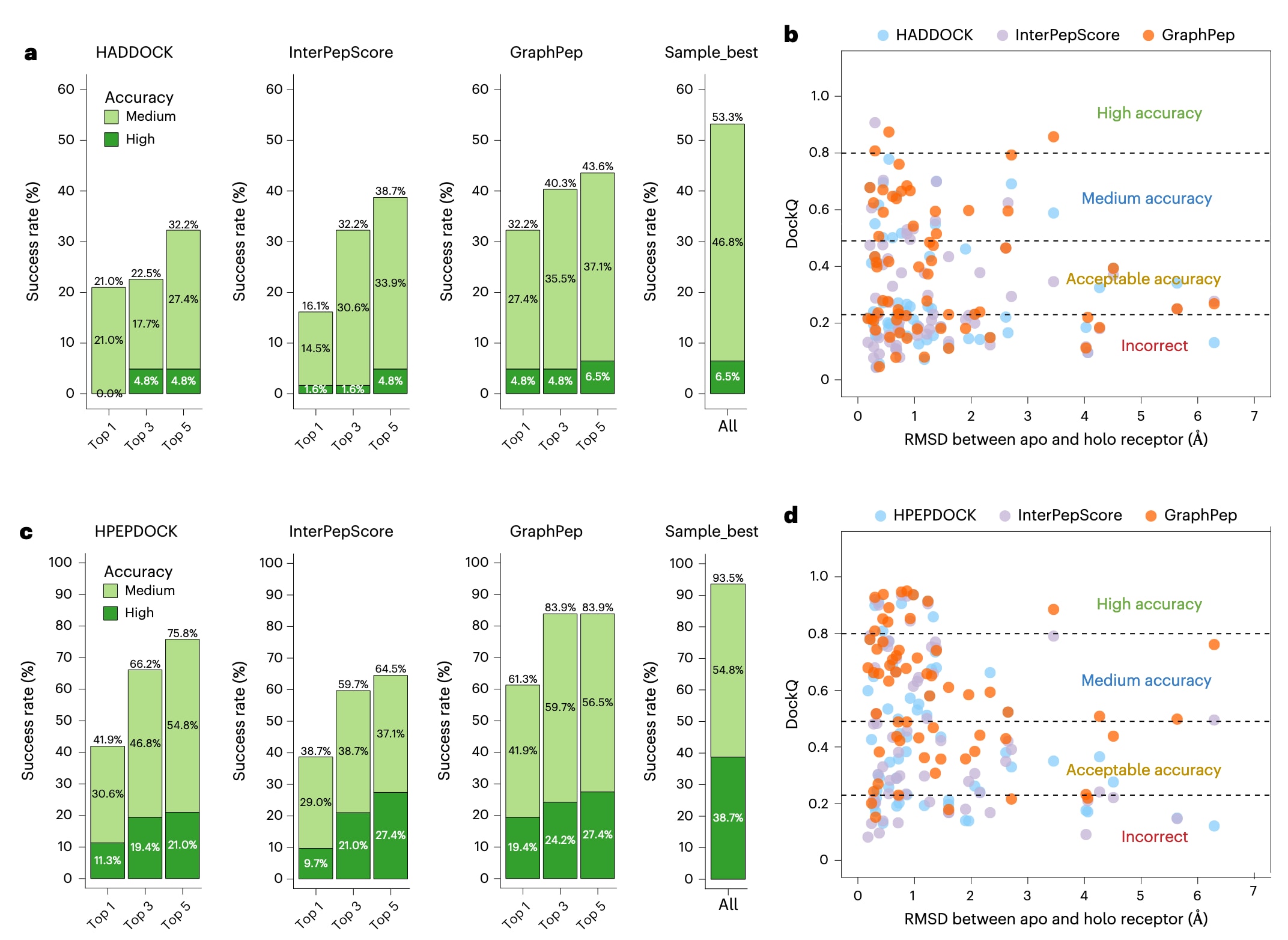 图3 | GraphPep与其他方法在Local_62非结合态测试集上的比较。 a、c,不同方法在由HADDOCK(a)与HPEPDOCK(c)生成的诱饵数据集上的Top 1、Top 3与Top 5预测成功率。作为参考,同时展示了采样效果最佳诱饵的结果。b、d,不同方法在由HADDOCK(b)与HPEPDOCK(d)生成的诱饵数据集上的Top 1 DockQ分数与受体apo与holo结构之间Cα RMSD的散点图。虚线表示DockQ分类区域的阈值,用以区分高精度、中等精度及低精度预测范围。