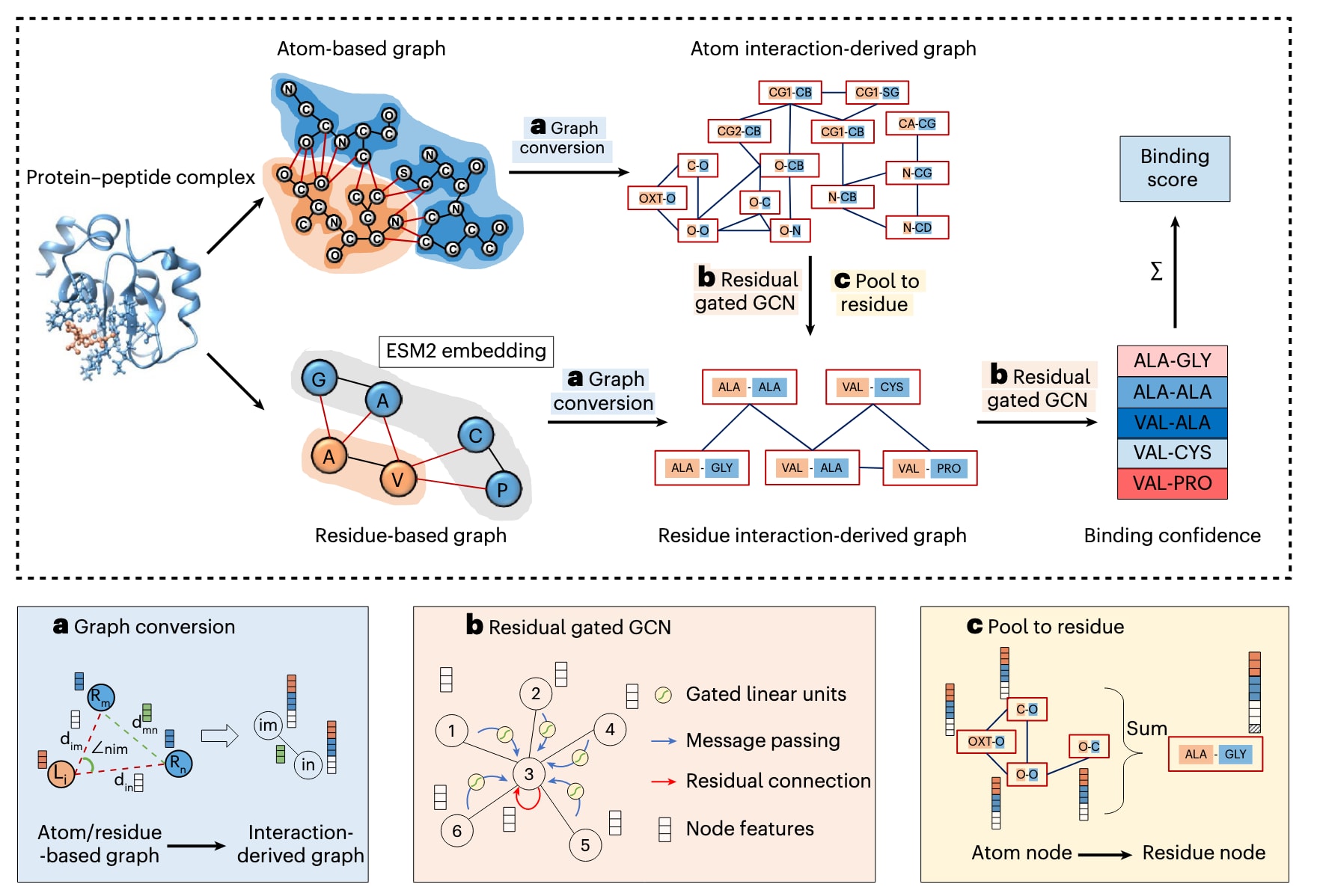 图1 | GraphPep框架示意图。 蛋白–肽复合物的原子层面与残基层面界面特征首先被提取并转换为基于相互作用的衍生图,从而使模型能够感知三角关系结构(triangle-aware),并仅保留代表蛋白–肽相互作用的节点。a,模型在原子层与残基层的相互作用衍生图上均应用残差门控图卷积网络(Residual Gated Graph Convolution)。b,原子层节点的特征被汇聚到对应的残基层节点中,用于进一步表征界面特征。c,最终,GraphPep在残基层图上执行节点分类,并整合各节点的置信度得分,计算出蛋白–肽结合构象的最终结合评分。