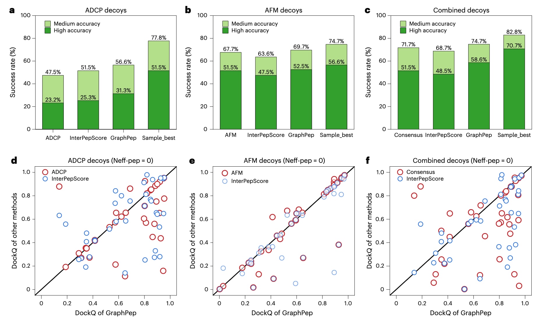 图4 | GraphPep与其他方法在ADCP99测试集上的比较。 a–c,不同方法在由ADCP(a)、AFM(b)及其组合诱饵集(c)生成的结构上的成功率比较。对于c中的组合诱饵排名,当肽的有效序列数Neff > 0时,采用AFM预测结果;否则根据各评分函数在组合诱饵集中的Top 1模型进行选择。作为参考,同时展示了采样效果最佳诱饵的结果。d–f,GraphPep与其他方法在由ADCP(d)、AFM(e)及其组合诱饵集(f)生成的结构上的Top 1 DockQ分数散点图。为便于展示,图中仅显示了肽的有效序列数Neff-pep = 0的复合物结果。