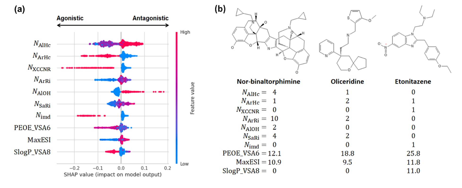 - 同样地,NXCCNR、NArHc与Nimd等特征的分布模式也与蜂群图分析结果一致:这些特征值的增加会推动模型输出向激动剂方向转移(图3a)。