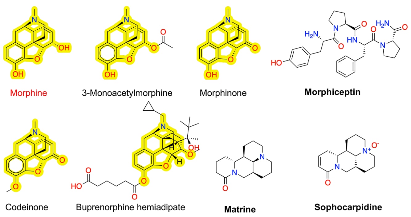 其中,苯并菲类衍生物数量最多,共288种分子(206个激动剂,82个拮抗剂)。这类化合物多来源于罂粟属植物的天然产物,代表结构为吗啡(morphine),还包括吗啡烷(morphinan)、4,5α-环氧吗啡烷(epoxymorphinan)与奥利帕维因(oripavine)。