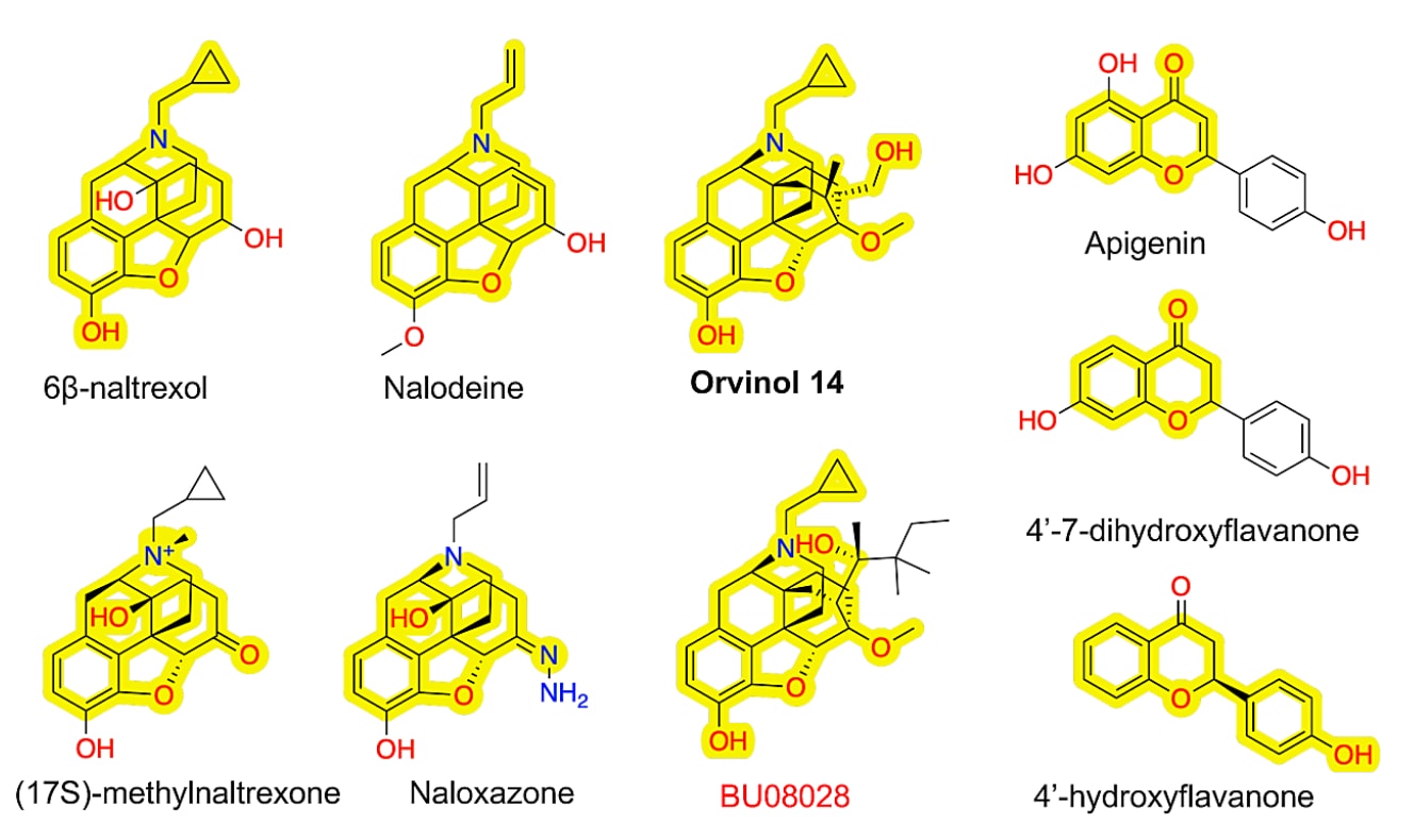 图4|外部验证集中基于菲类(a)与黄酮类(b)拮抗剂的化学结构。 图中标出了模型用于预测拮抗活性的关键子结构。加粗的分子名称表示被模型错误预测为激动剂的化合物。在菲类化合物中,orvinol 14的关键子结构也存在于训练集中激动剂**BU08028(红色标示)**中,共同的结构单元已在图中高亮显示。