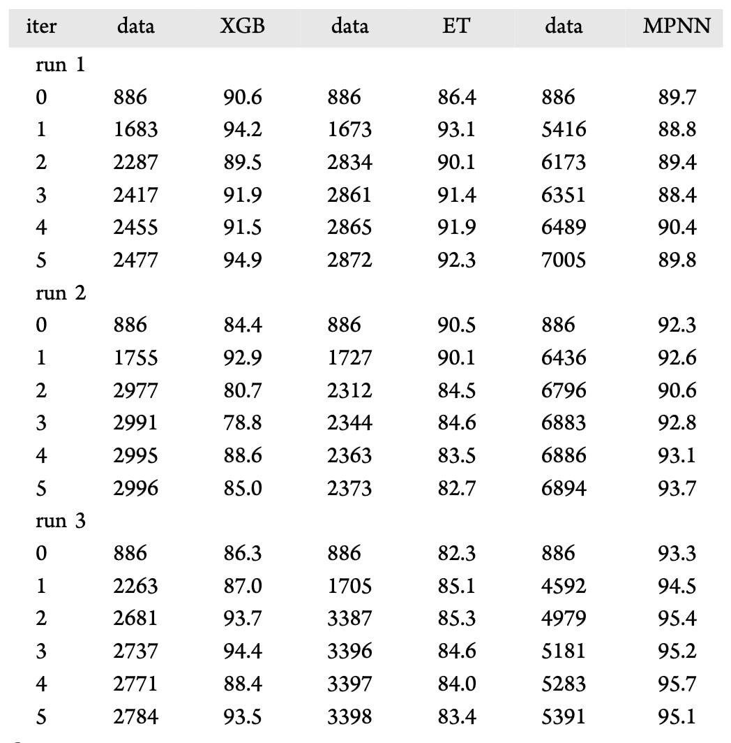 这一差异与三模型在各轮训练中获得的新增数据量有关:至第 5 次迭代,XGB 与 ET 仅分别新增 22 与 7 条数据,而 MPNN 在第一次迭代后获得了大量新增样本,表明树模型间预测过于相似,常常一致,而 MPNN 则能提供更多分歧信息。在第二次运行中,初始 AUC 分别为 84.4%(XGB)、90.5%(ET) 与 92.3%(MPNN)。数据增长趋势与第一次运行一致,再次证明树模型相似而 MPNN 差异较大。XGB 模型在第一次迭代后测试与外部验证 AUC 均显著上升,而 ET 模型在任何迭代中均未改善(表4与表S6)。MPNN 模型的 AUC 变化较小,但除第二次迭代外,其余轮次测试 AUC 均高于初始值——第一次迭代后测试 AUC 提升至 92.6%(初始为92.3%),对应外部验证 AUC 从 83.0% 提升至 84.2%。在第三次运行中,三模型的初始 AUC 分别为 86.3%(XGB)、82.3%(ET) 与 93.3%(MPNN)。数据增长趋势与前两次类似,但 MPNN 获得的新增样本略少。随着迭代次数增加,三模型的测试 AUC 均显著上升,最高分别达到 94.4%、85.3% 与 95.7%。然而,外部验证的 AUC 并未保持同步,仅在 XGB 模型的第一次迭代中出现明显提升。这种留出测试与外部验证结果间的不一致,可能源于外部数据集样本量过小。