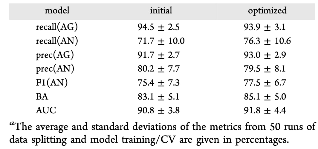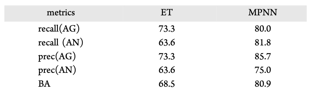 图神经网络(GNN)通常在大数据集上表现优于传统树模型。为验证这一假设,研究团队基于SMILES分子结构图并使用ChemProp默认参数训练了定向消息传递神经网络(MPNN)模型。结果显示,其初始性能与ET模型相当,平均平衡准确率(BA)为83.1%,F1(拮抗剂类)为75.4%,AUC为90.8%(表2)。