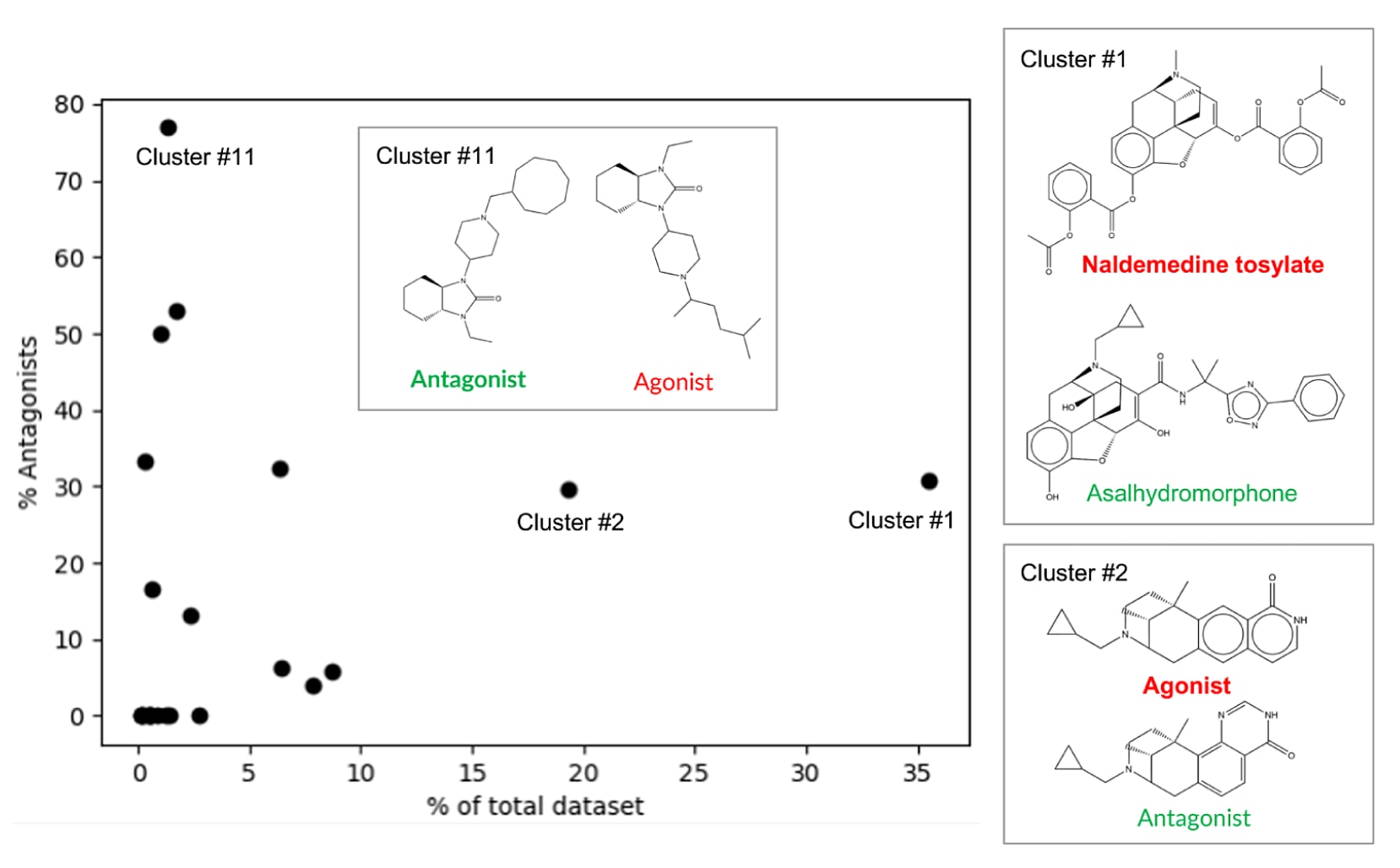图2|人源μ-阿片受体(μOR)激动剂与拮抗剂训练数据集中化学结构的聚类分析。 横坐标表示聚类编号(按分子数量由大到小排列),纵坐标表示拮抗剂所占百分比。图中展示了各聚类的相对分布情况。对于cluster #1、#2与#11,给出了其代表性分子结构(聚类中心,粗体标示)及其在相反功能类别中结构最相似的化合物(即具有最高Tanimoto相似度的分子)。文中提及的这些具体化合物(如asalhydromorphone与naldemedine tosylate等)在正文部分进行了进一步讨论。