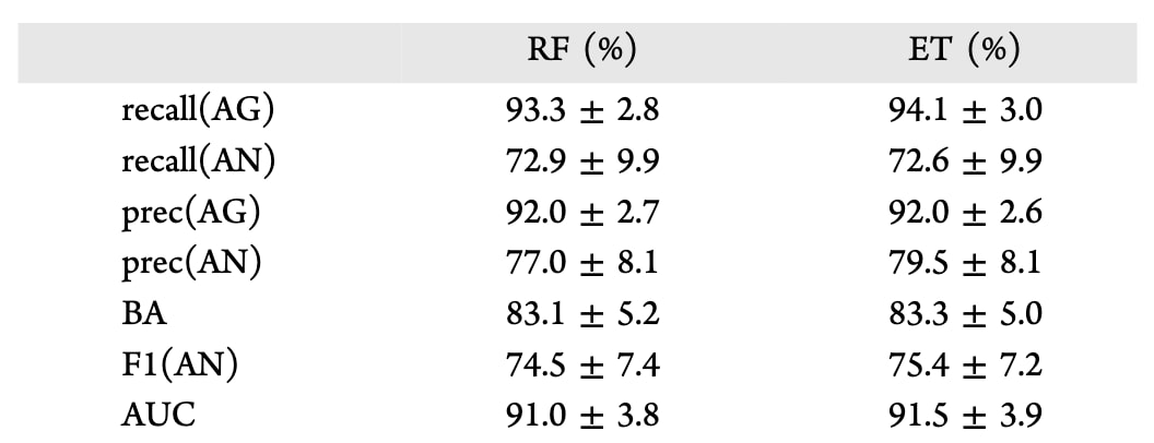 - ET模型:召回率 94.1 ± 3.0%,精确率 92.0 ± 2.6%。