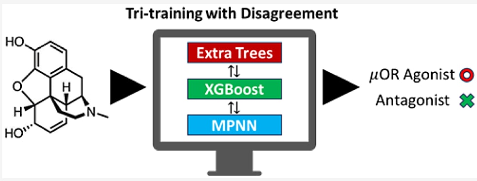 为突破小样本带来的限制,研究者还引入了名为**“三重训练(tritraining with disagreement)”的师生式学习策略,结合包含15,816个未标记的阿片受体配体(涵盖人、鼠与大鼠的μOR、κOR与δOR)**的新数据集进行半监督学习。