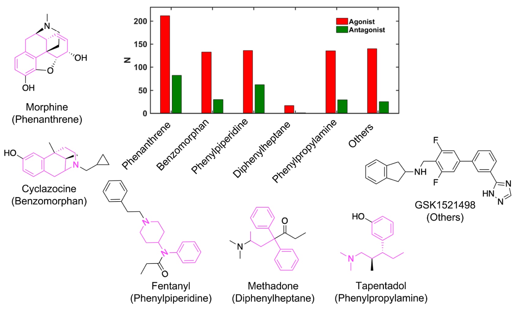 图1|人源μ-阿片受体(μOR)激动剂与拮抗剂训练数据集中代表性的阿片类化合物结构类型。 图中展示了五大主要化学骨架类别下的配体分布,包括苯并菲(phenanthrene)、苯并吗啡烷(benzomorphan)、苯基哌啶(phenylpiperidine)、二苯庚烷(diphenylheptane)与苯丙胺(phenylpropylamine)。其中,红色表示激动剂(agonists),绿色表示拮抗剂(antagonists),对应的数量以N标注。其余不属于上述骨架的分子被归入“others”类别。图中以洋红色标示了来源于这些主要骨架的常见阿片类药物,并展示了一个新型合成阿片化合物作为“others”类的示例。