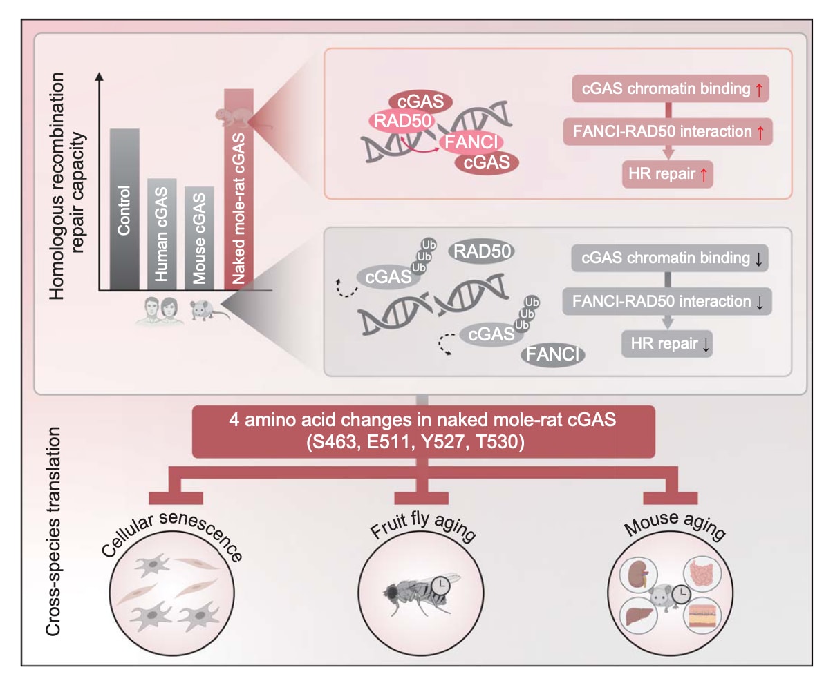 高效的DNA修复能力或许是裸鼹鼠长寿的重要原因。然而,目前尚不清楚这种动物是否具备针对DNA修复抑制因子进行功能优化的独特机制。研究发现,裸鼹鼠的环鸟苷酸–腺苷酸合成酶(cGAS)在进化过程中通过四个氨基酸残基的改变,失去了人类与小鼠同源蛋白在同源重组修复(HR repair)中的抑制作用。这些氨基酸变化削弱了cGAS与E3泛素连接酶TRIM41及分离酶P97的相互作用,从而使其在DNA受损后能够更长时间地滞留于染色质上。这种延长的结合促进了修复因子FANCI与RAD50之间的相互作用,并进一步增强RAD50在损伤位点的募集,最终提升了同源重组修复效率。此外,这四个关键氨基酸还赋予cGAS抗细胞与组织衰老的能力,从而延缓机体老化并延长寿命。因此,调控cGAS的功能可能成为延长寿命的一种潜在机制。