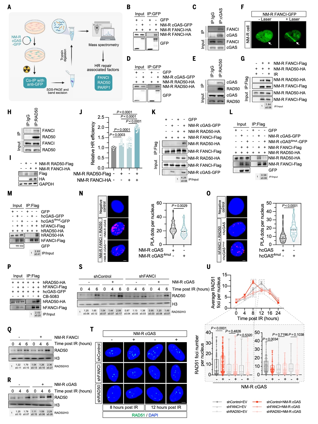 图4|裸鼹鼠cGAS通过增强FANCI–RAD50相互作用促进RAD50募集与同源重组修复 (A) 实验设计示意图。为鉴定与裸鼹鼠cGAS(NM-R cGAS)相互作用的同源重组(HR)修复相关因子,在裸鼹鼠成纤维细胞(NSFs)中转染带有GFP标签的NM-R cGAS,接受8 Gy X射线照射15分钟后进行共免疫沉淀(co-IP)及质谱分析(图由BioRender.com绘制)。(B、C) cGAS与FANCI的蛋白互作验证。在(B)中于NSFs中过表达NM-R cGAS与FANCI,进行co-IP验证;在(C)中使用人源成纤维细胞(HCA2-hTERT)检测内源性cGAS–FANCI相互作用。(D、E) cGAS与RAD50的蛋白互作验证。在(D)中于NSFs中过表达NM-R cGAS与RAD50进行co-IP检测;在(E)中进一步验证其在NSFs中的内源性结合。(F) FANCI在DNA损伤位点的招募。利用激光微照射诱导NSFs中DNA损伤,观察带GFP标签的NM-R FANCI在损伤位点的富集情况(箭头所示为照射位置)。(G、H) FANCI与RAD50的互作分析。在(G)中,NSFs在是否经8 Gy X射线处理后均进行co-IP检测,结果显示辐照增强FANCI–RAD50结合约1.8倍;(H)为其内源性交互验证。(I、J) FANCI与RAD50对HR修复效率的影响。在NSFs中过表达NM-R FANCI、RAD50或两者共表达,并使用空载体平衡转染量。(I)中通过Western blot验证蛋白表达,(J)中显示相对HR修复效率。结果表明共表达FANCI与RAD50显著增强HR修复。误差线表示标准差(SD)。(K) NM-R cGAS过表达增强FANCI–RAD50相互作用。在HEK-293FT细胞中过表达NM-R cGAS后,检测到FANCI与RAD50的结合增强。(L) NM-R cGAS四残基突变体对FANCI–RAD50互作的影响。突变后促进效应显著减弱。(M) 人类cGAS四残基突变体对FANCI–RAD50互作的影响。在人类cGAS中引入对应突变可增强FANCI–RAD50结合,与NM-R cGAS的变化方向相反。(N、O) PLA近邻连接实验分析。在HeLa细胞中分别检测过表达NM-R (N)与人类(O) cGAS及其突变体对FANCI–RAD50相互作用的影响(比例尺:5 μm)。结果表明,裸鼹鼠cGAS促进而人类cGAS破坏FANCI–RAD50结合,这种功能差异由四个关键氨基酸决定。(P) P97抑制剂对人类cGAS调控FANCI–RAD50相互作用的影响。使用10 μM P97抑制剂CB-5083处理HEK-293FT细胞4小时,结果显示该处理消除了人类cGAS对FANCI–RAD50结合的抑制效应,提示cGAS的染色质结合状态在调控中至关重要。(Q–S) RAD50在DNA损伤后染色质招募的变化。(Q) 过表达NM-R FANCI促进RAD50装载到染色质上;(R) 过表达NM-R cGAS同样增强RAD50染色质募集;(S) 在敲低FANCI的细胞中,这种由cGAS介导的促进作用完全消失。HEK-293FT细胞经8 Gy X射线照射后于4与6小时收集样本。(T、U) RAD51募集分析。在FANCI或RAD50缺失的NSFs中,经8 Gy X射线照射后于不同时间点检测RAD51的聚集情况。结果表明,NM-R cGAS在正常细胞中促进RAD51募集,但在缺乏FANCI或RAD50的背景下失效(比例尺:5 μm)。显著性采用Mann–Whitney U检验。