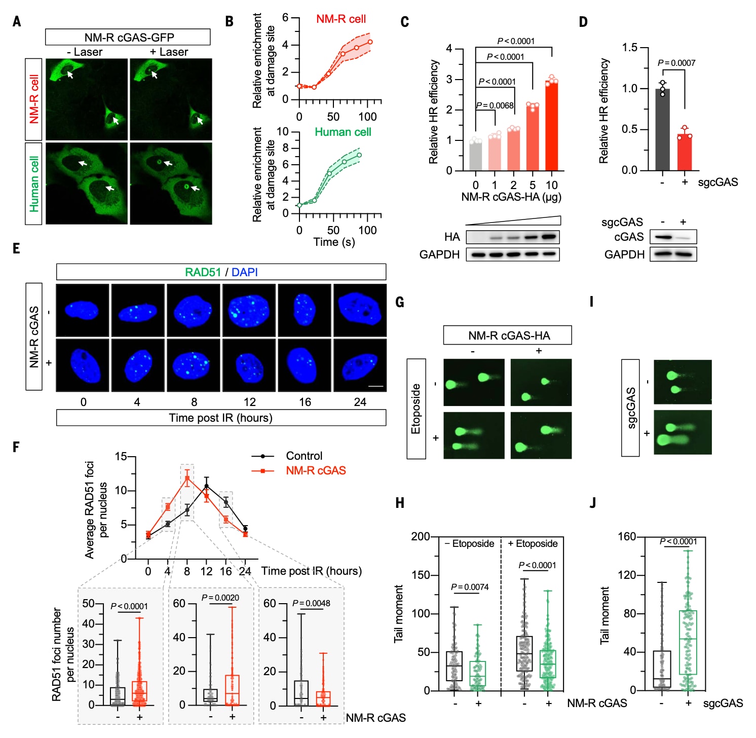 利用GFP报告体系评估HR修复效率发现:人类与小鼠cGAS的过表达会抑制HR修复,而裸鼹鼠cGAS则呈剂量依赖性增强HR修复活性。此外,在裸鼹鼠细胞中通过CRISPR-Cas9敲除cGAS可抑制HR修复,而再表达则恢复修复能力,进一步证明其功能与人、小鼠相反。值得注意的是,即使催化失活突变体(E257A/D259A或D351A)也能促进HR修复,说明这种作用与其酶活性无关。由于HR仅在细胞周期S与G2期发生,研究确认这一促进作用并非源于细胞周期分布变化。免疫荧光结果显示,裸鼹鼠cGAS过表达可加速HR关键重组酶RAD51的募集,并促进DSB标志物γH2AX的清除。彗星实验进一步证实其能增强基因组稳定性,而cGAS缺失则导致DNA稳定性下降。