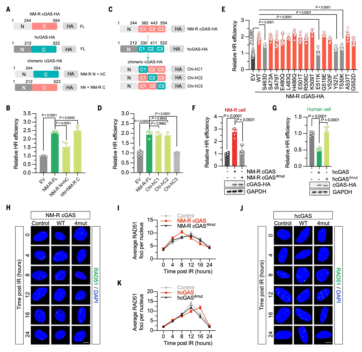 图2|四个氨基酸决定裸鼹鼠cGAS增强同源重组修复(HR)的能力 (A) 构建示意图。展示了带有HA标签的裸鼹鼠全长cGAS(NM-R cGAS-FL)、人类cGAS以及两者的嵌合构建体结构示意。(B) 嵌合cGAS对HR修复效率的影响。在裸鼹鼠成纤维细胞(NSFs)中过表达不同嵌合形式的cGAS,评估其对HR修复效率的影响。结果表明,含有人源C端的嵌合体失去增强HR的作用,而保留裸鼹鼠C端的构建体保持促进功能。显著性分析采用单因素方差分析(ANOVA)并经Tukey多重比较校正。(C) C端亚结构域替换示意图。将裸鼹鼠cGAS的C端分为三个亚结构域(C1–C3),并逐一以人类cGAS的相应序列替换。(D) 不同C端亚结构域替换对HR修复的影响。实验显示,仅当C3区段(位点444–554)保持裸鼹鼠序列时,HR修复效率显著提升。统计分析同样使用单因素方差分析(ANOVA)与Tukey校正。(E) 16个位点单残基突变的功能筛查。将裸鼹鼠cGAS的16个特征性残基分别替换为人类cGAS对应氨基酸后,检测其对HR修复效率的影响。氨基酸单字母缩写:A(丙氨酸)、C(半胱氨酸)、D(天冬氨酸)、E(谷氨酸)、F(苯丙氨酸)、G(甘氨酸)、H(组氨酸)、I(异亮氨酸)、K(赖氨酸)、L(亮氨酸)、M(甲硫氨酸)、N(天冬酰胺)、P(脯氨酸)、Q(谷酰胺)、R(精氨酸)、S(丝氨酸)、T(苏氨酸)、V(缬氨酸)、W(色氨酸)、Y(酪氨酸)。细胞共转染线性化HR报告系统、DsRed报告质粒及相应cGAS突变体表达载体,转染48小时后通过流式细胞仪(FACS)分析。显著性检验采用ANOVA与Dunnett’s T3多重比较。(F) 裸鼹鼠cGAS的四残基突变体显著削弱HR修复增强作用。在NSFs中过表达野生型(WT)或含四个关键突变(S463D+E511K+Y527L+T530K)的NM-R cGAS后,测得其HR修复能力下降。蛋白表达经Western blot验证。(G) 人类cGAS的四残基突变体失去HR抑制功能。在人源永生化皮肤成纤维细胞(HCA2-hTERT)中过表达野生型或四残基突变体(D431S+K479E+L495Y+K498T)的cGAS后,结果显示突变体逆转了原本的抑制效应。统计检验采用ANOVA与Dunnett’s多重比较。(H–K) RAD51灶形成动力学分析。在NSFs与HCA2-hTERT中分别过表达裸鼹鼠[(H)、(I)]或人类[(J)、(K)] cGAS的野生型或四残基突变体,观察辐照(8 Gy X射线)后不同时间点的RAD51荧光灶形成与消退过程(比例尺:10 μm)。结果显示,野生型NM-R cGAS促进RAD51快速募集与修复,而四残基突变体则明显减弱这一效应;在人类cGAS中,四残基突变体则消除了其对RAD51募集的抑制。误差线:在(B)、(D)–(G)中表示标准差(SD),在(I)、(K)中表示标准误差(SEM)。