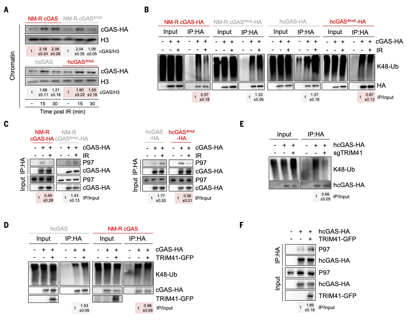 图3|DNA损伤后裸鼹鼠cGAS在染色质上的结合时间更长 (A) DNA损伤后cGAS染色质结合分析。在人胚肾细胞(HEK-293FT)中分别转染野生型(WT)或四残基突变体(4mut)的人类与裸鼹鼠cGAS,第二天以8 Gy X射线照射诱导DNA损伤。结果显示,裸鼹鼠cGAS在损伤后仍强烈结合于染色质,而其4mut突变体迅速解离;人类cGAS则相反,突变体在染色质上的保留更持久。灰度图显示了相对于组蛋白H3的cGAS-HA染色质结合量。(B) K48连接型泛素化水平分析。在HEK-293FT细胞中检测DNA损伤后15分钟内野生型或4mut人类/裸鼹鼠cGAS的K48型泛素化水平。结果表明,人类cGAS在照射后泛素化显著增强,而裸鼹鼠cGAS变化不明显,突变体的引入可逆转此差异。(C) cGAS与分离酶P97的相互作用。在照射15分钟后检测HEK-293FT细胞中P97与野生型或4mut人类/裸鼹鼠cGAS的结合。结果显示,裸鼹鼠cGAS与P97的结合减弱,而人类cGAS与P97的相互作用增强;突变后则呈相反趋势。(D) TRIM41过表达对cGAS泛素化的影响。在人源HEK-293FT细胞中过表达E3泛素连接酶TRIM41后,人类cGAS的K48型泛素化水平上升约1.5倍,而裸鼹鼠cGAS几乎未受影响。(E) TRIM41敲低对人类cGAS泛素化的影响。在HeLa细胞中敲低TRIM41后,DNA损伤15分钟时检测到cGAS的K48型泛素化水平明显下降。(F) TRIM41过表达增强人类cGAS与P97的结合。在HEK-293FT细胞中过表达TRIM41后,检测到P97–cGAS相互作用显著增强。以上所有实验均独立重复三次,定量结果以**平均值 ± 标准差(SD)**表示,并在图中各面板中展示。