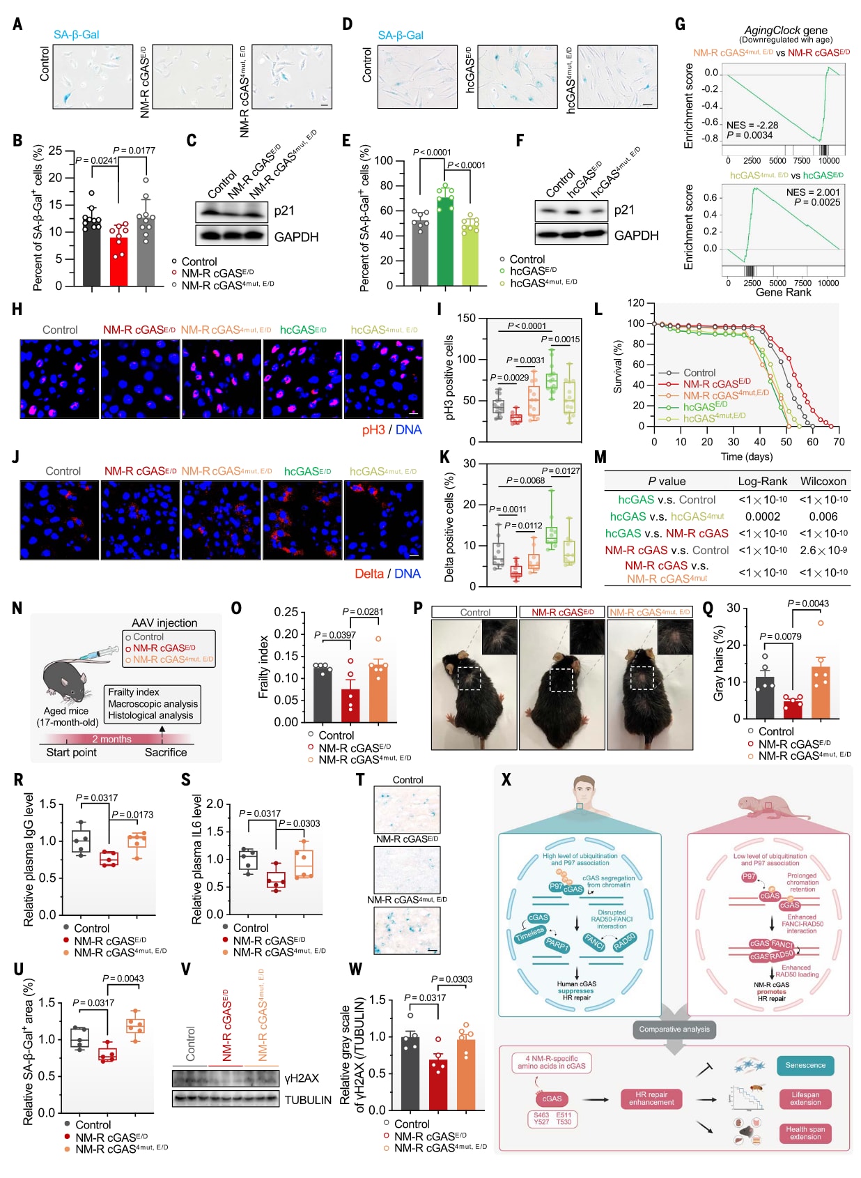 图5|四个氨基酸赋予裸鼹鼠cGAS更强的抗细胞衰老、延缓组织老化与延长寿命的能力 (A–C) 裸鼹鼠cGAS抑制早衰(SIPS)的效应。在裸鼹鼠成纤维细胞(NSFs)中过表达催化失活型NM-R cGAS(E257A/D259A,简称E/D)及其四残基突变体后,进行8 Gy X射线照射诱导SIPS。通过SA–β–gal染色[(A)、(B)]与p21蛋白水平(C)评估细胞衰老。结果显示,野生型NM-R cGAS显著抑制细胞衰老,而突变体失去此效应(比例尺:100 μm)。(D–F) 人类cGAS促进细胞衰老,突变后逆转。在人源成纤维细胞(HCA2-hTERT)中敲低内源hcGAS后,分别过表达催化失活型人类cGAS(E225A/D227A)及其四残基突变体,并以6 Gy X射线诱导SIPS。SA–β–gal染色[(D)、(E)]与p21表达(F)结果显示,人类cGAS促进衰老,而突变体逆转该现象(比例尺:200 μm)。统计分析采用单因素方差分析(ANOVA)与Tukey多重比较检验。(G) Drosophila肠道中AgingClock基因表达的GSEA富集分析。结果显示,裸鼹鼠cGAS^E/D显著上调AgingClock基因集(NES为标准化富集分值),而四残基突变后该效应消失。(H–K) 老年果蝇肠道的细胞增殖与干细胞活性分析。利用pH3免疫染色[(H)、(I)]与Notch配体Delta染色[(J)、(K)]检测老年果蝇肠道细胞增殖。结果显示,裸鼹鼠cGAS^E/D显著减少肠细胞分裂与干细胞活性,而突变体失去保护作用(比例尺:10 μm)。(L、M) 果蝇寿命分析。在29°C下,分别表达催化失活型人类/裸鼹鼠cGAS及其突变体的转基因果蝇进行寿命测定。结果显示,裸鼹鼠cGAS^E/D显著延长果蝇的平均与最大寿命,而突变体失去该效应;人类cGAS^E/D缩短寿命,突变体则恢复正常。显著性检验采用log-rank与Gehan–Breslow–Wilcoxon双检验。(N) 小鼠AAV注射实验设计示意图(使用NIAID NIH BioArt素材绘制)。在17月龄小鼠尾静脉注入携带裸鼹鼠cGAS^E/D、其四残基突变体或对照载体的AAV病毒。(O) 小鼠体弱指数(Frailty Index)分析。注射两个月后测量健康状况,结果显示:裸鼹鼠cGAS^E/D组体弱指数显著降低,而突变体无改善。(P、Q) 小鼠皮毛与皮肤状态。注射裸鼹鼠cGAS^E/D的老年小鼠毛发变白较轻、皮肤更健康,灰毛比例定量分析如(Q)所示(每只小鼠计数100根毛发)。(R、S) 血浆中IgG与IL-6水平检测(ELISA)。结果显示,裸鼹鼠cGAS^E/D组IgG与IL-6水平均显著低于突变体与对照组,提示全身炎症反应减轻。(T、U) 肝脏组织衰老检测。SA–β–gal染色(T)及定量分析(U)表明,裸鼹鼠cGAS^E/D显著减少肝脏衰老细胞数量(比例尺:50 μm)。(V、W) γH2AX水平分析。Western blot结果显示,裸鼹鼠cGAS^E/D组肝脏DNA双链断裂(DSBs)积累更少。显著性分析采用Mann–Whitney U检验。(X) 人类与裸鼹鼠cGAS功能机制模型图(由BioRender.com绘制)。在人类细胞中,DNA损伤诱导cGAS泛素化增加,从而增强P97介导的染色质解离,并破坏FANCI–RAD50复合物。同时,人类cGAS还削弱PARP1–Timeless相互作用,最终延迟RAD51募集并抑制HR修复。而在裸鼹鼠中,不存在PARP1–Timeless相互作用。cGAS的四个氨基酸变化使其泛素化水平降低、染色质结合更稳定,并增强与P97、FANCI–RAD50的协同作用,从而促进RAD50装载及RAD51募集,显著提升HR修复能力。这四个氨基酸的差异削弱了裸鼹鼠cGAS的抑制功能,使其获得更强的抗衰老潜力,延长果蝇寿命、减缓小鼠组织老化并改善生理健康。