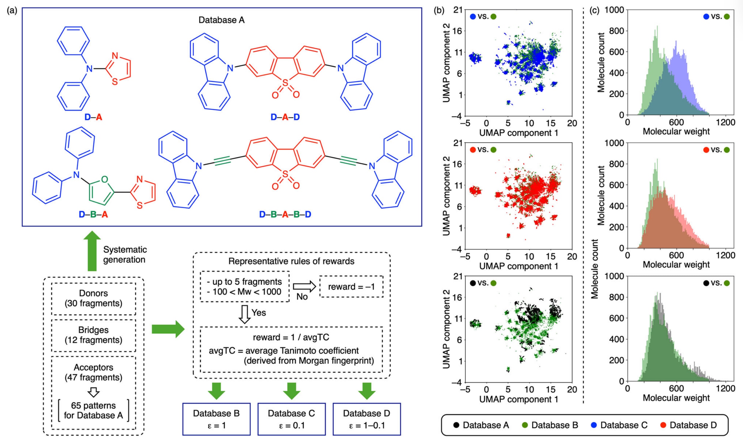 图2|数据库的生成与比较。 (a) 数据库构建规则:Database A中的分子通过在预设位置系统性地组合供体(D)、桥接(B)与受体(A)片段生成;而Databases B、C 与 D则由研究团队自主开发的分子生成器(molecular generator)构建。 (b) 各数据库的化学空间分布,基于Morgan指纹经UMAP降维所得结果。(c) 各数据库的分子量分布,用于展示不同生成策略下分子复杂度与组成的差异。