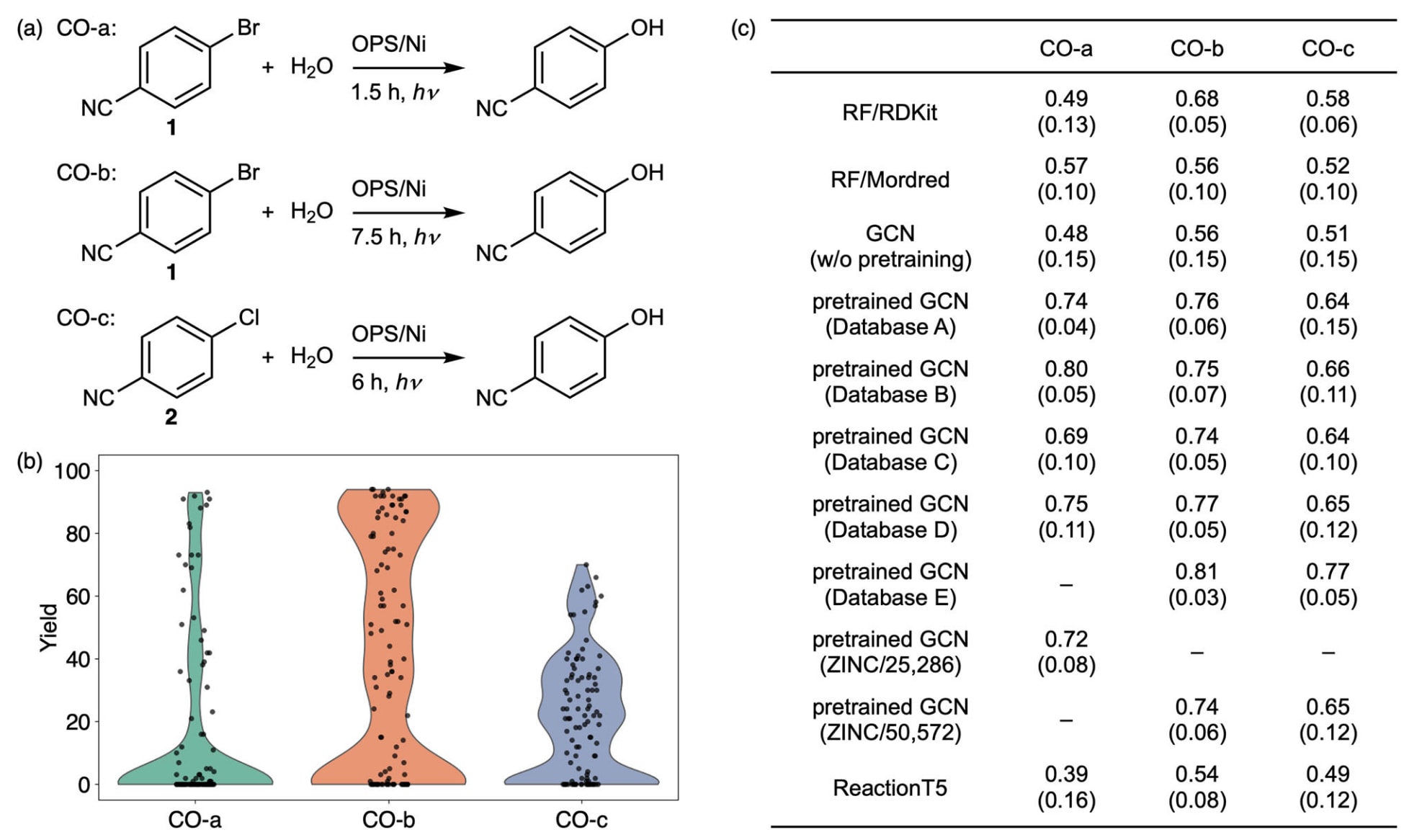 - CO-b:RF/RDKit=0.68,RF/Mordred=0.56,GCN无预训练=0.56;
