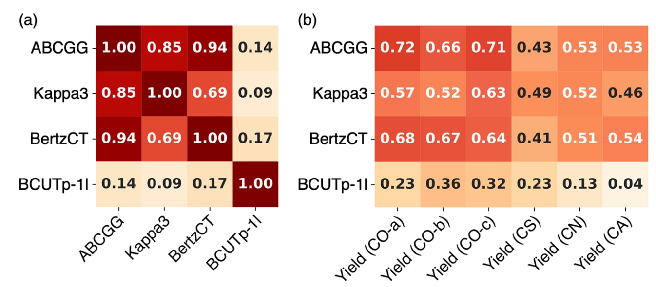 尽管三者基于不同的数学计算公式而得,但在100种真实OPS分子中表现出高度相关性(见图5a;Databases A–D的相关性结果见附图S16–S19)。此外,这些拓扑指数与C–O键形成反应的产率之间也存在较强的相关性(见图5b;相关系数为0.52–0.72),而与C–S、C–N及[2+2]环加成反应产率的相关性则处于中等水平(0.41–0.54)。