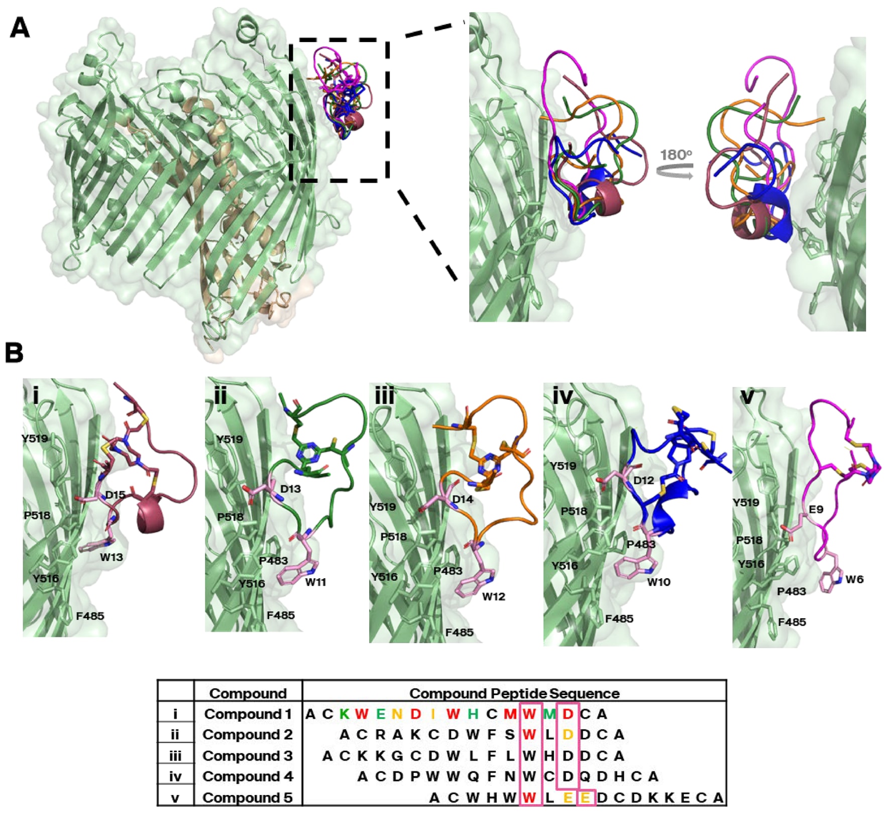 在该表位中成像的五个分子(化合物1–5)具有一致的结合特征:其序列中存在保守的W×(D/EE)模体,与SfLptD的β桶形成稳定相互作用(见图4B)。其中的色氨酸残基嵌入由Pro483、Phe485、Tyr516和Pro518组成的疏水口袋内;Arg520与Tyr516通过氢键进一步稳定该模体,与D/EE残基的主链和侧链均形成接触(见补充图S7)。其他肽段,尤其是面向洗涤剂胶束的一侧,排列一致性较差(见图4与表1)。