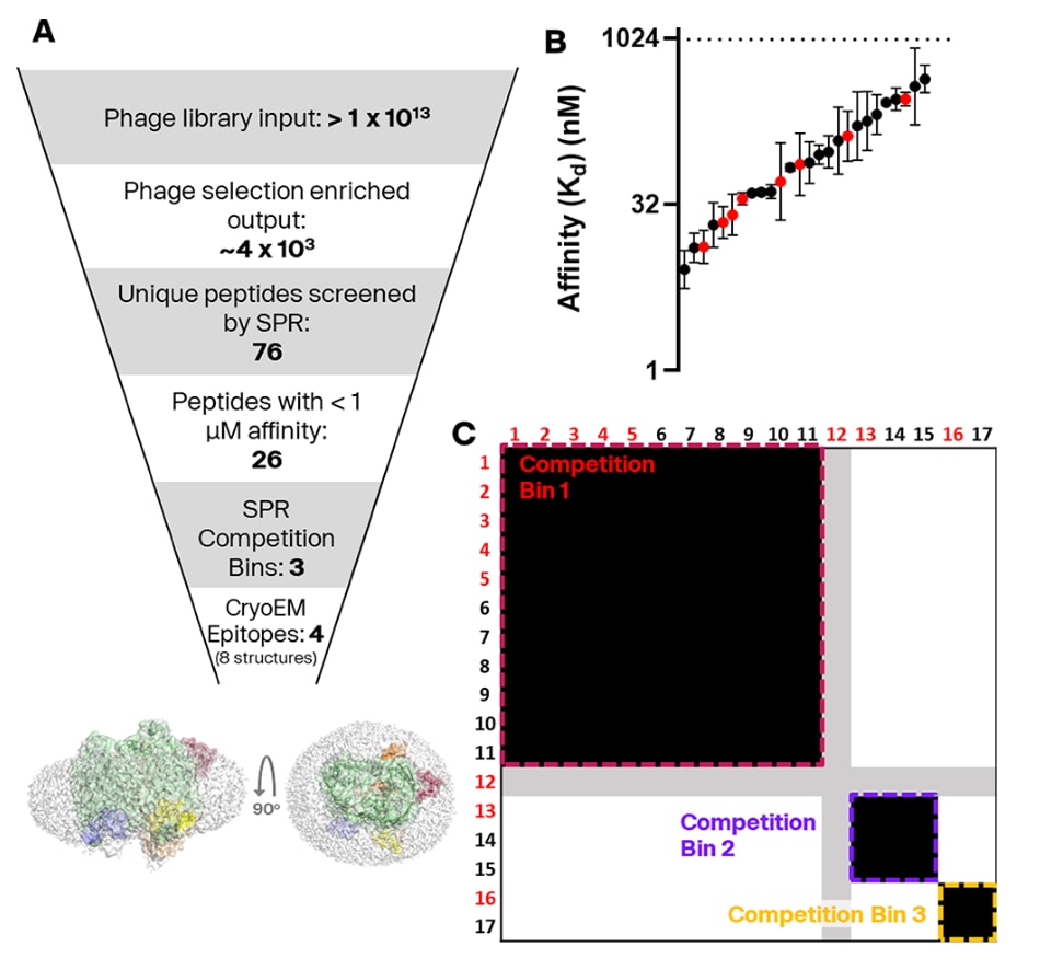 图2|筛选流程概览与SPR检测结果。 (A) 展示筛选流程的整体步骤示意。图中显示了双环肽分子与SfLptDE在四个不同表位上的结合情况(LptDE由胶束包围)。“竞争分组(competition bin)”与“表位(epitope)”的定义见正文说明。 (B) 通过表面等离子体共振(SPR)检测测定了76种肽分子与LptDE_FL的结合亲和力,其中26种肽的亲和力结果如图所示。其余50种肽被判定为无结合或非特异性结合。该实验中可可靠测得的最弱亲和力为1 μM。红色标示的化合物为后续用于冷冻电镜分析的样品。误差线表示至少两次独立生物重复的几何标准差。 (C) SPR竞争分组实验的热图视图。每一行/列代表一个肽分子的相互作用模式。肽–肽相互作用被分类为竞争(黑色)、非竞争(白色)或不确定(灰色)。每组相互作用的重复次数见补充图S3E。化合物12的相互作用结果无法明确分类,因为其未表现出与自身竞争的现象,而这一自竞争信号是关键的阳性对照,其代表性传感图见补充图S3D。