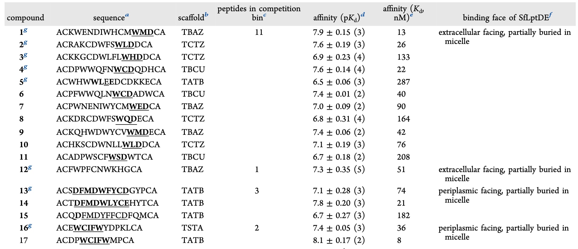 突变实验进一步验证了该模体的重要性:将W残基突变为Ala完全消除肽的结合能力,而将Asp/Glu替换为Ala显著降低结合亲和力(见图4与补充表S3)。这说明尽管双环肽与SfLptDE的结合界面相对较小,其结合仍具有较高的序列特异性,高通量筛选过程并未仅筛出非特异性与胶束结合的分子。然而,当突变位于面向胶束的疏水环区时(如化合物1),结合同样被完全破坏(见图4与补充表S3),表明胶束环境在双环肽–SfLptDE结合的稳定性中也起到重要作用。
