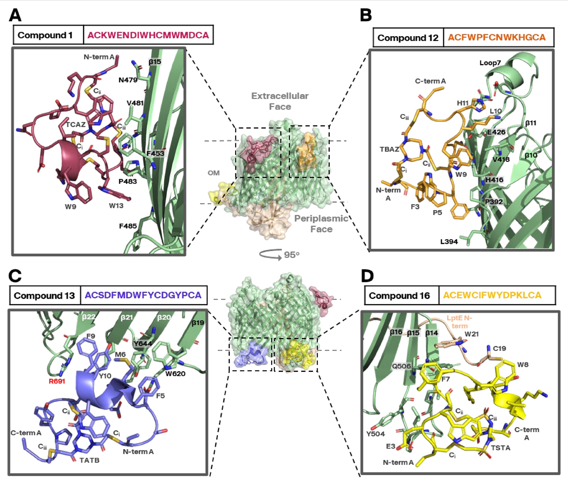 在所有数据集中,双环肽分子均可在电子密度图中清晰构建,显示其在SfLptDE复合体上存在四个独立表位的结合模式。所有肽在各自表位上的结合方式相似,如化合物12所示,其一面与β桶外缘相互作用,另一面与洗涤剂胶束接触(见图3)。整体上,四个结合位置分别为: