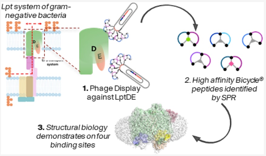 该研究采用噬菌体展示技术发现针对这一困难膜靶点的双环肽(Bicycle分子)。Bicycle分子是一类双环肽,通过含三半胱氨酸的线性肽与三价支架发生反应形成两个环。环化产生的构象约束通常可提高靶标特异性与亲和力,同时增强抗蛋白酶降解的稳定性。Bicycle噬菌体展示平台提供了一种高通量、高效率的策略,用于筛选目标结合性环肽。这类化合物的化学空间类似于天然抗菌肽,但后者难以化学修饰,而Bicycle分子则可完全人工调控,便于药物优化。