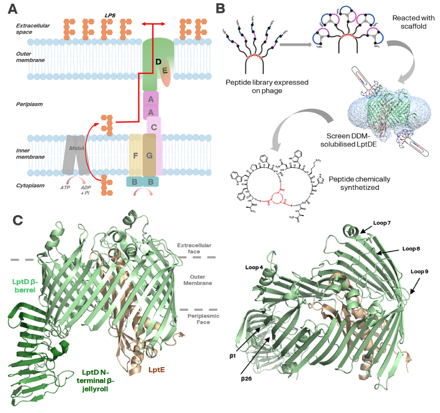 图1|针对志贺菌LptDE的双环肽噬菌体展示。 (A) LptDE是Lpt蛋白家族中最下游的成员,负责将脂多糖(LPS)从内膜运输至革兰氏阴性菌的外膜。该复合物由LptD与LptE组成。 (B) 基于靶点的Bicycle平台药物发现流程利用展示线性肽的噬菌体,这些肽随后通过化学支架(红色所示)环化形成双环肽,并以噬菌体形式展示。通过多轮亲和力筛选可富集与LptDE复合物结合的肽分子,之后进行化学合成(图示为化合物12,比例未按实际比例绘制)。 (C) SfLptDE复合物的晶体结构(PDB编号:4Q35),其N端β果冻卷结构域形成一个V形疏水沟,向周质侧延伸并与LptA接触。外膜相关的β桶由26条反平行β链(β1–β26)构成,这些β链在周质侧通过转角连接,而在细胞外侧则形成覆盖桶腔的延展环结构。LPS分子需通过这些环的重排才能到达外膜外层。LptE紧密嵌入LptD的β桶内部。